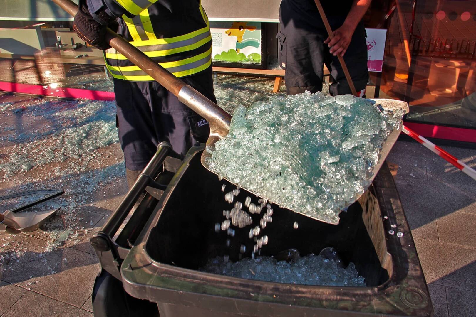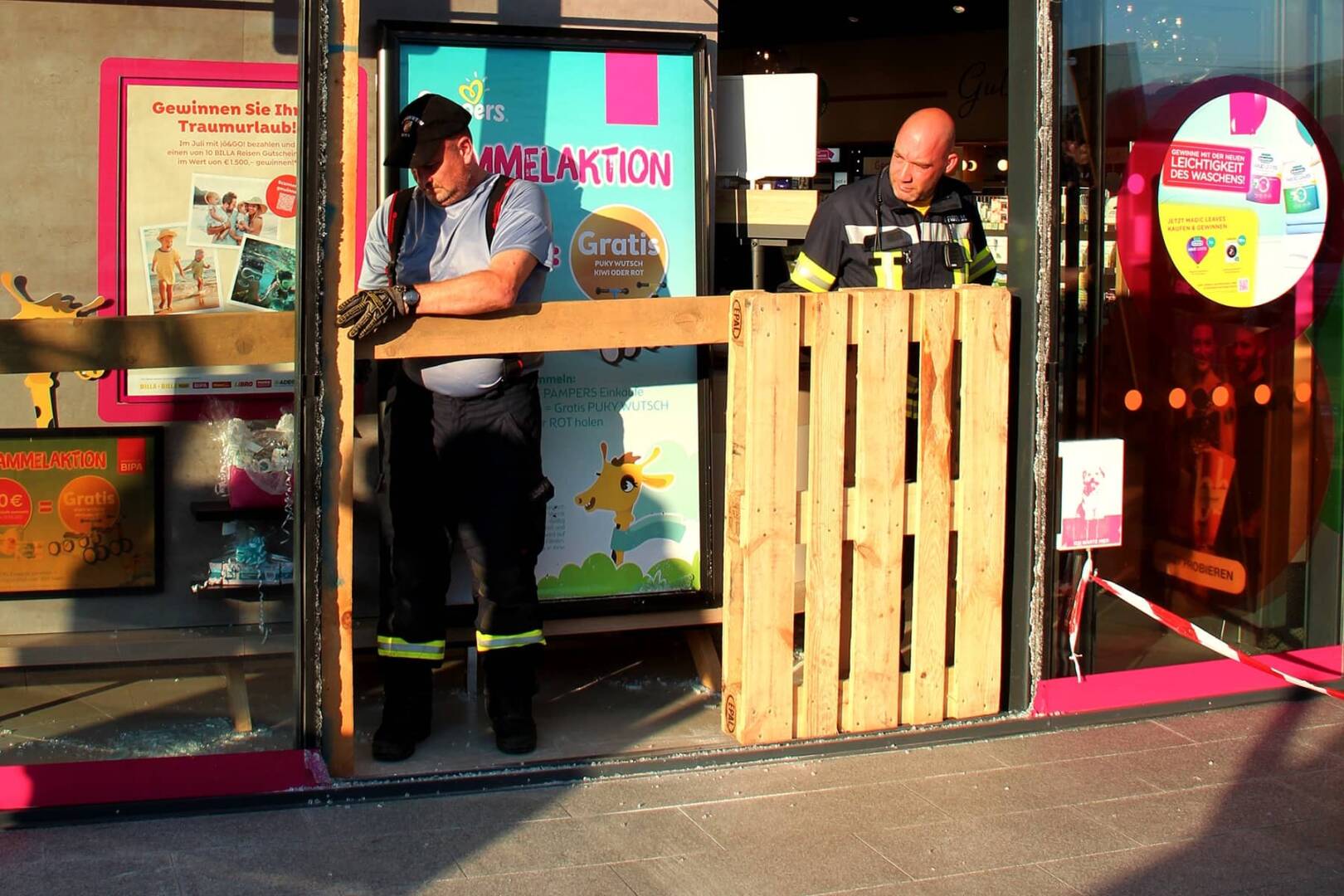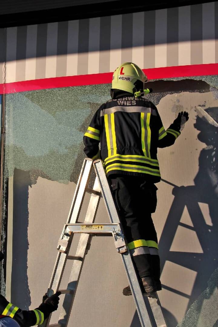 Die Feuerwehr Wies wurde daraufhin um 18.22 Uhr über die Rufempfänger zum Einsatz alarmiert. Nach dem Absichern des Gefahrenbereichs wurden die losen Glasteile der Fassade entfernt. Die Glassplitter, welche sich auf Gehweg, Parkplatz und Geschäftslokal verteilt hatten, wurden zusammengekehrt und entsorgt. Um das Geschäft wieder „dicht“ zu bekommen, wurde die offene Fassade mit Holzplatten und Folie zugeschraubt bzw. verklebt.