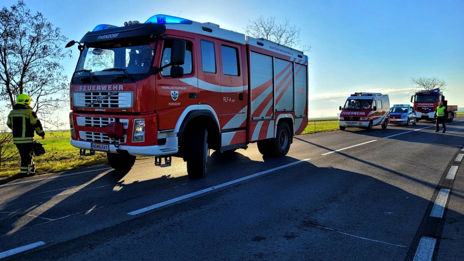 Die Alarmierung durch die LSZ lautete „Verkehrsunfall mit eingeklemmter Person und brennendem Fahrzeug“. Bei der Ankunft der FF Neudorf am Einsatzort waren bereits Rettung und Bundesheer vor Ort und kümmerten sich um die verletzte Person. Ein Brand konnte glücklicherweise nicht mehr festgestellt werden.