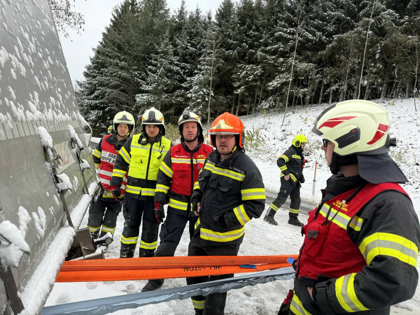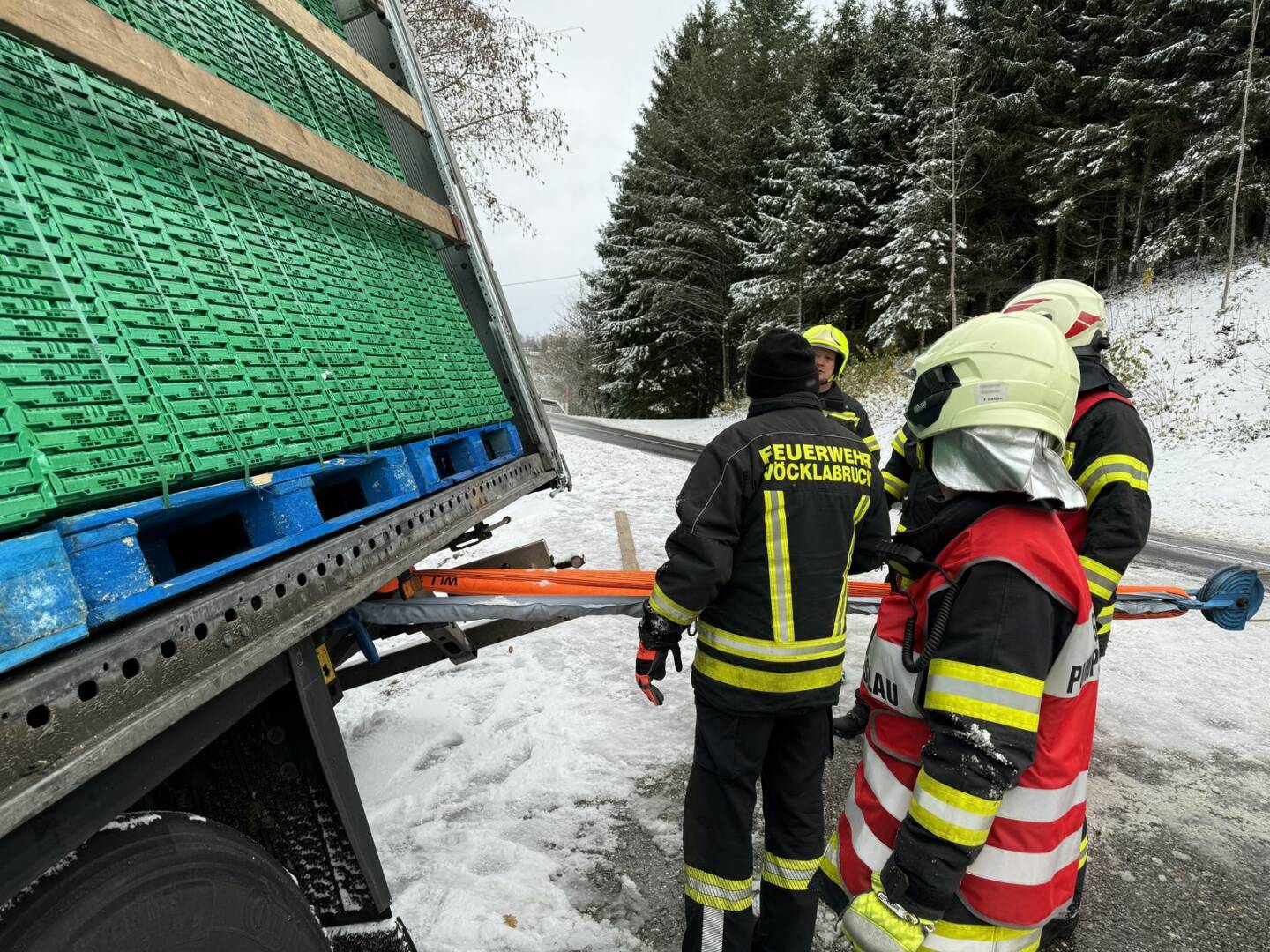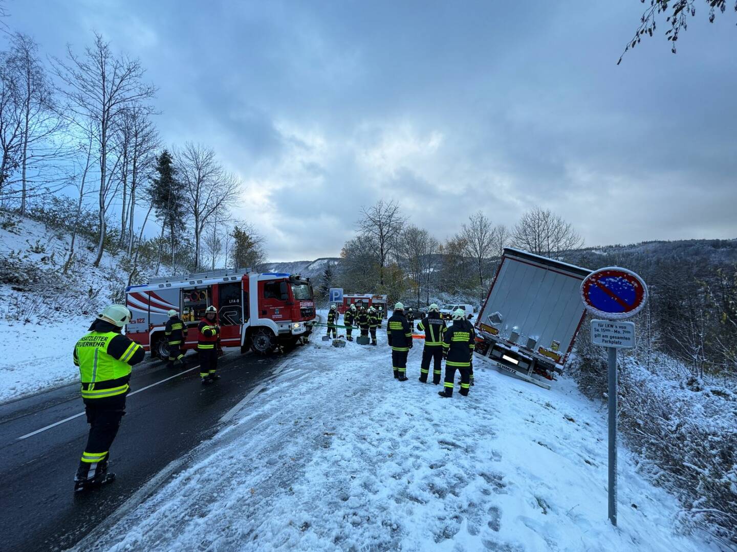 Beim Eintreffen am Einsatzort stellte sich für Einsatzleiter Stefan Buchner die Lage wie folgt dar: „Der Sattelauflieger drohte aufgrund der winterlichen Verhältnisse hinten weiter die Böschung runterzurutschen, die Ladung war sichtbar verrutscht. Sofort begannen wir mit der Sicherung des LKW’s!“