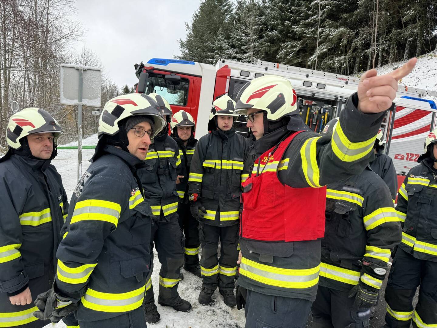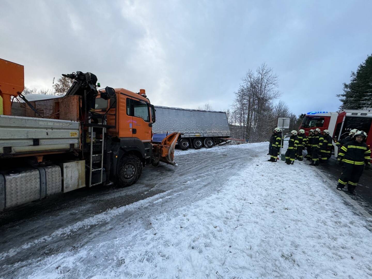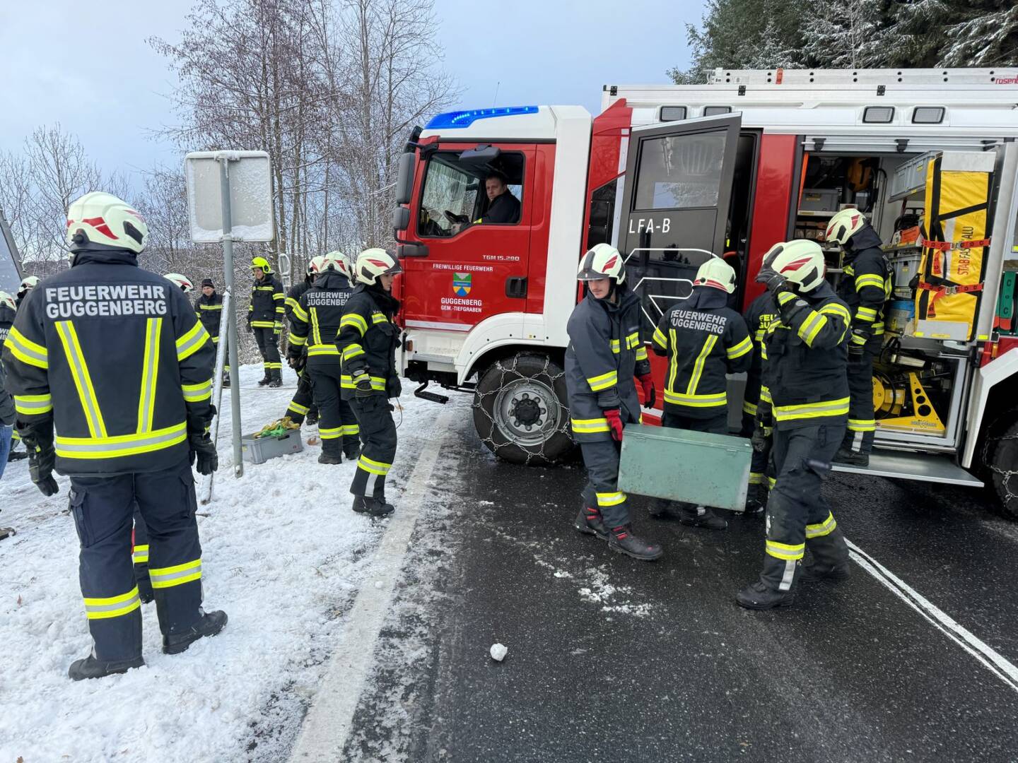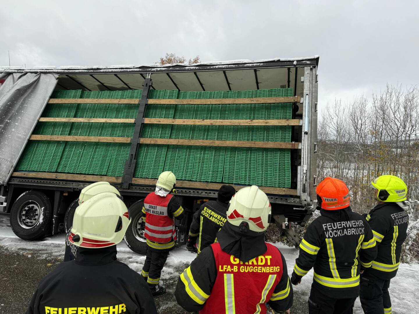 Beim Eintreffen am Einsatzort stellte sich für Einsatzleiter Stefan Buchner die Lage wie folgt dar: „Der Sattelauflieger drohte aufgrund der winterlichen Verhältnisse hinten weiter die Böschung runterzurutschen, die Ladung war sichtbar verrutscht. Sofort begannen wir mit der Sicherung des LKW’s!“