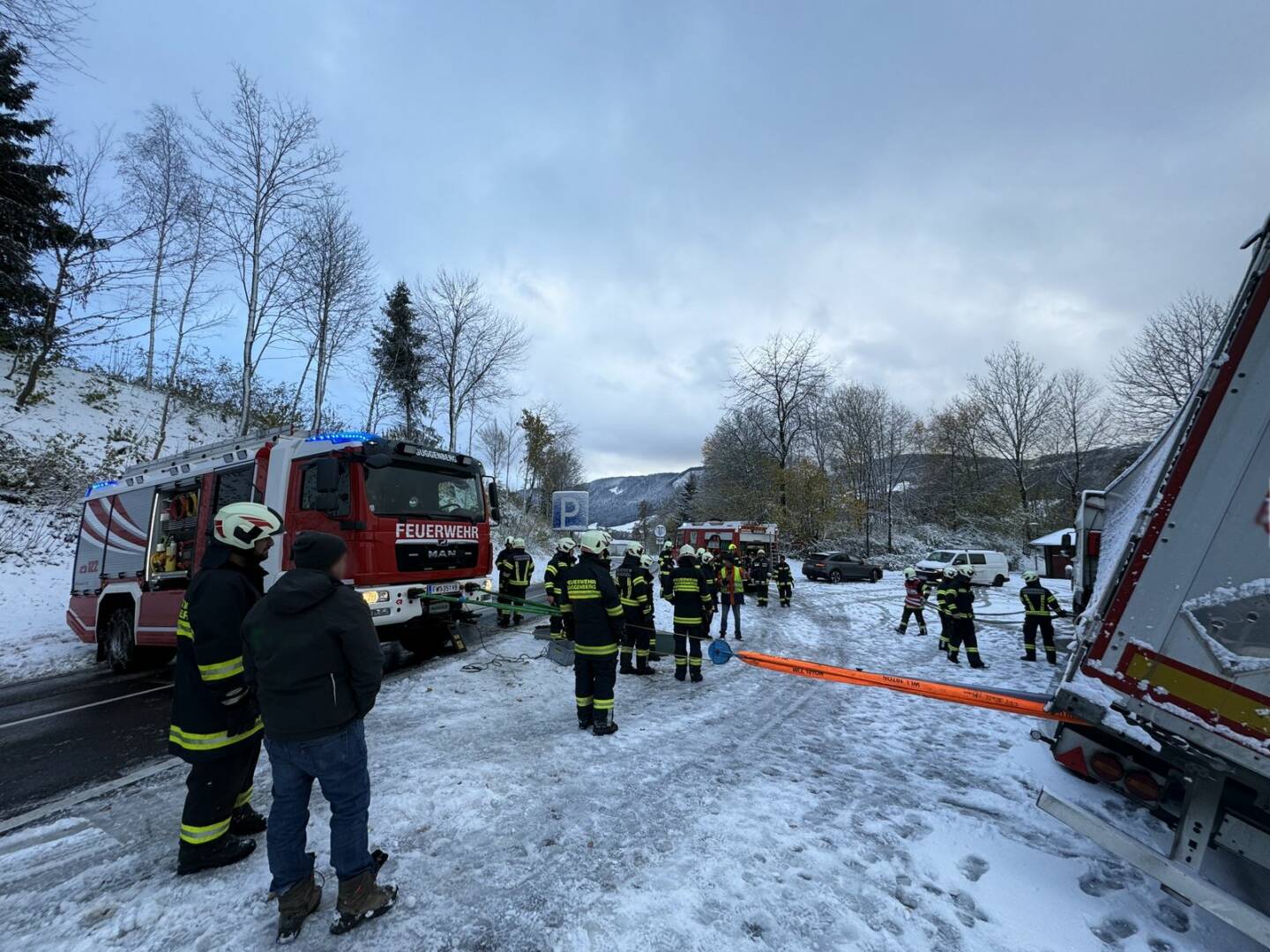 Am Samstag, den 25.11.2023 wurden die Feuerwehren Zell am Moos und Haslau um 8.37 Uhr zu einer LKW-Bergung alarmiert. Ein Sattelzug war beim Zurückstoßen am Parkplatz Nahe der B154 Mondsee Straße mit dem Sattelauflieger teilweise über die Böschung gerutscht.