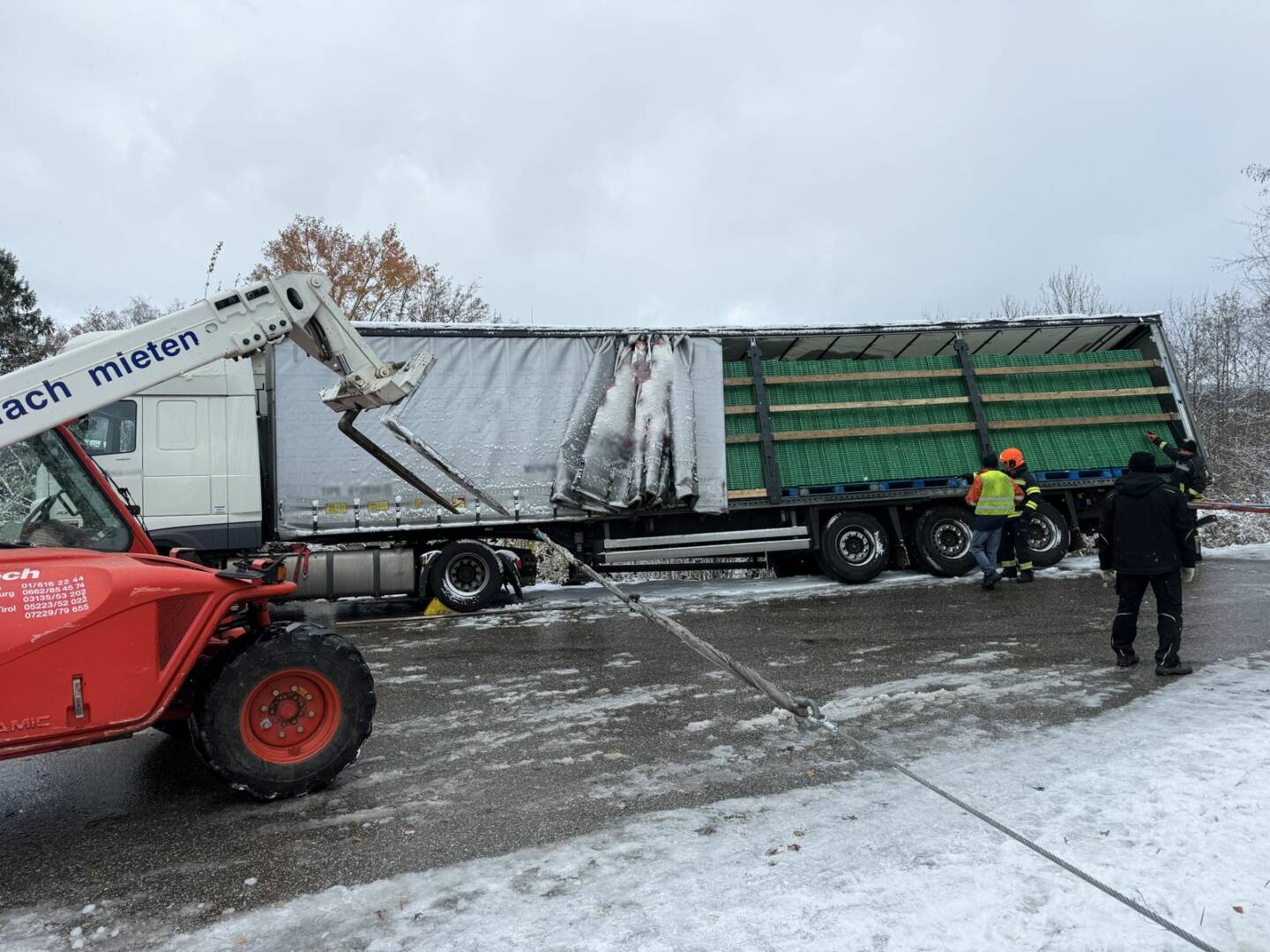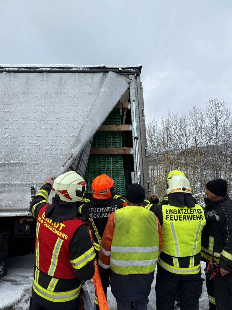 In weiterer Folge alarmierte der Einsatzleiter die Feuerwehr Guggenberg und den Kran aus Vöcklabruck, um genügend Seilwinden und schweres Bergegerät verfügbar zu haben. Mit zwei Seilwinden und dem Kran konnte Sattelschlepper aus seiner Lage geborgen werden.