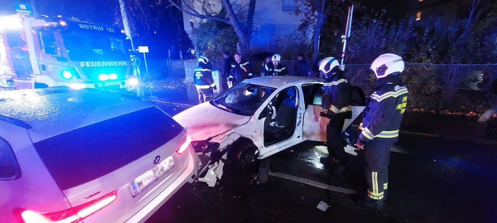 Von den Einheiten der Berufsfeuerwehr Wien wurde das elektrisch angetriebene Unfallfahrzeug stabilisiert, abgesichert und ein Brandschutz aufgebaut. Der Beifahrer konnte mit Hilfe der Rettungskräfte das Fahrzeug verlassen. In der Zwischenzeit übernahm ein Team der Berufsrettung Wien die notfallmedizinische Versorgung des im Fahrzeug eingeklemmten Mannes, ehe er von den Feuerwehrleuten mit hydraulischem Rettungsgerät aus seinem Fahrzeug befreit werden konnte. Gemeinsam hoben Feuerwehrleute und Rettungsdienstmitarbeiter den Mann mit einem Rettungsbrett aus dem Fahrzeug, bevor er zur weiteren Behandlung in ein Krankenhaus gebracht werden musste. Von der Berufsrettung Wien wurde anschließend noch eine weitere Person hospitalisiert.