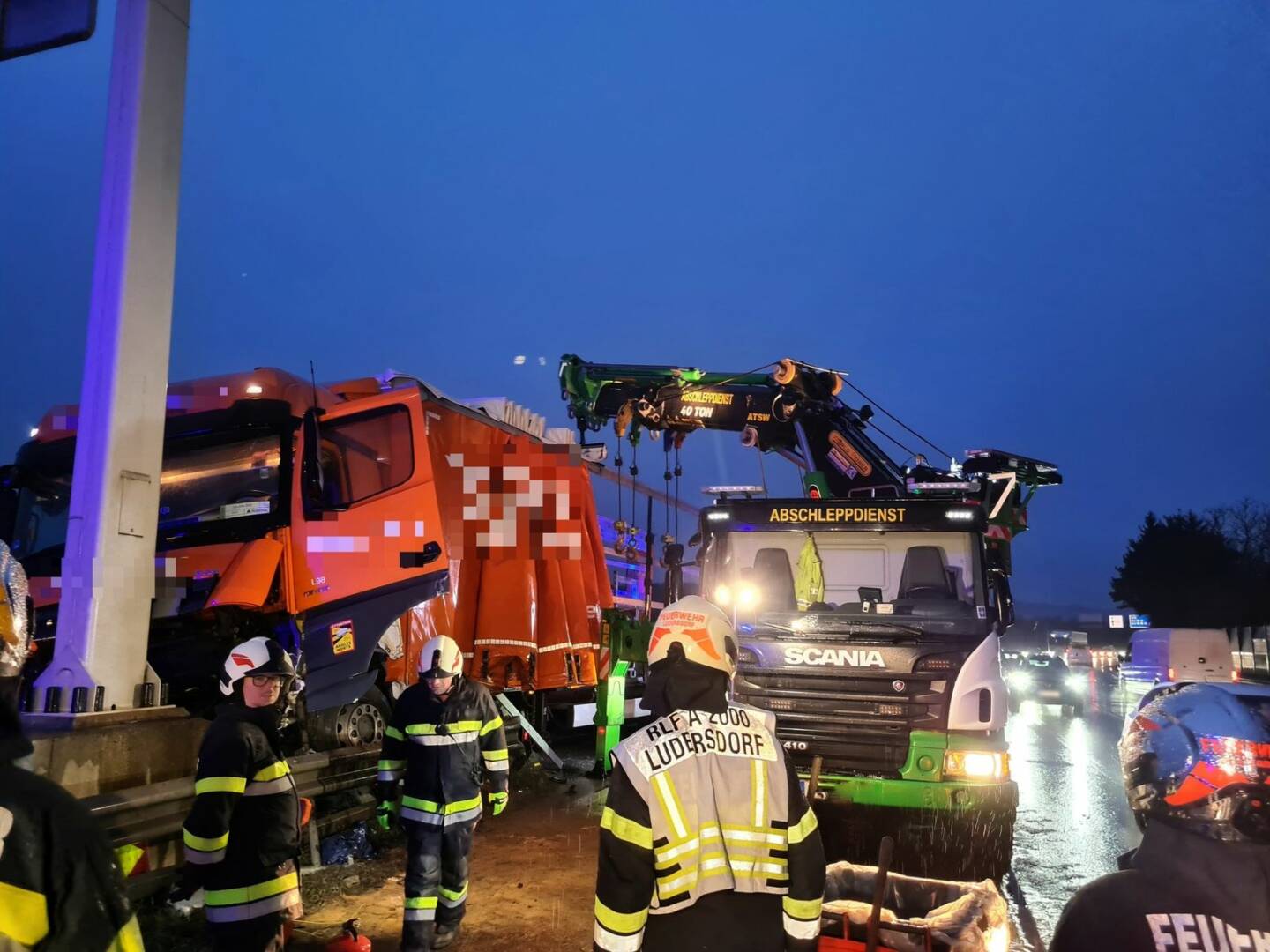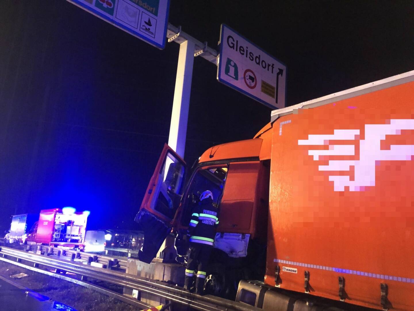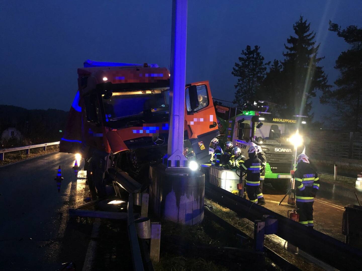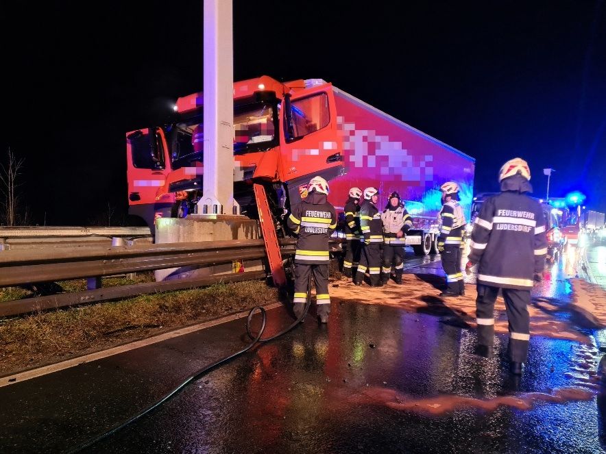 Heute um kurz vor 6 Uhr morgens wurden wir zu einem schweren LKW-Verkehrsunfall mit einer vermutlich einklemmten Person auf die B54 alarmiert. In Fahrtrichtung JET-Kreisverkehr ist es im Bereich der Abfahrtsrampe Richtung Gleisdorf zu einem Unfall mit einem Schwerlastkraftfahrzeug gekommen, wobei der Lenker des Fahrzeuges, aus bisher unbekannter Ursache, einen Betonpfeiler mit voller Wucht frontal gerammt hat.
