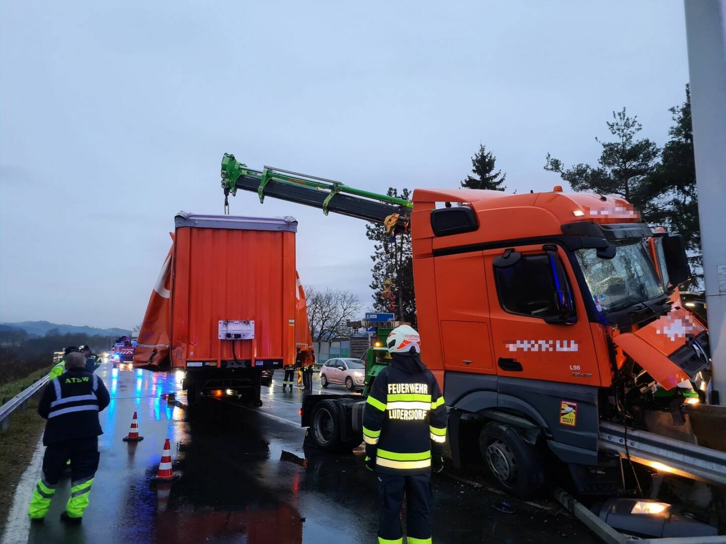 Durch die Wucht des Aufpralls wurde das Führerhaus des LKWs schwer demoliert und der Fahrer unbestimmten Grades verletzt. Wir retteten gemeinsam mit dem Rotes Kreuz Gleisdorf, dem Notarztsystem Weiz und der Freiwillige Feuerwehr der Stadt Gleisdorf den Fahrer mittels Schaufeltrage und Rettungsplattform aus dem deformierten Wrack. Nach der Erstversorgung wurde die verletzte Person in ein Krankenhaus eingeliefert.