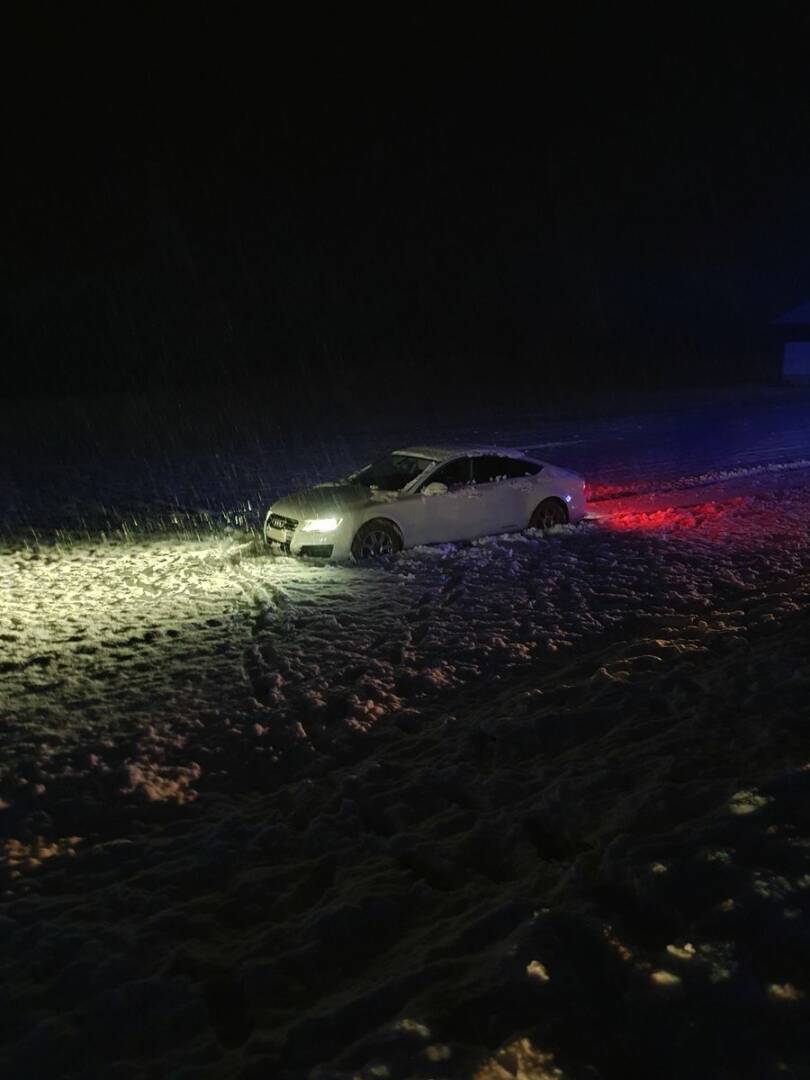 Es konnte festgestellt werden, dass ein PKW im dichten Schneefall von der Fahrbahn abkam und seitlich im Straßengraben in einem Feld zum Stehen kam. Ein eigener Versuch des Besitzers, selbst auf die Straße zu kommen, schlug fehl und der Wagen grub sich nur noch weiter in den Schlamm.