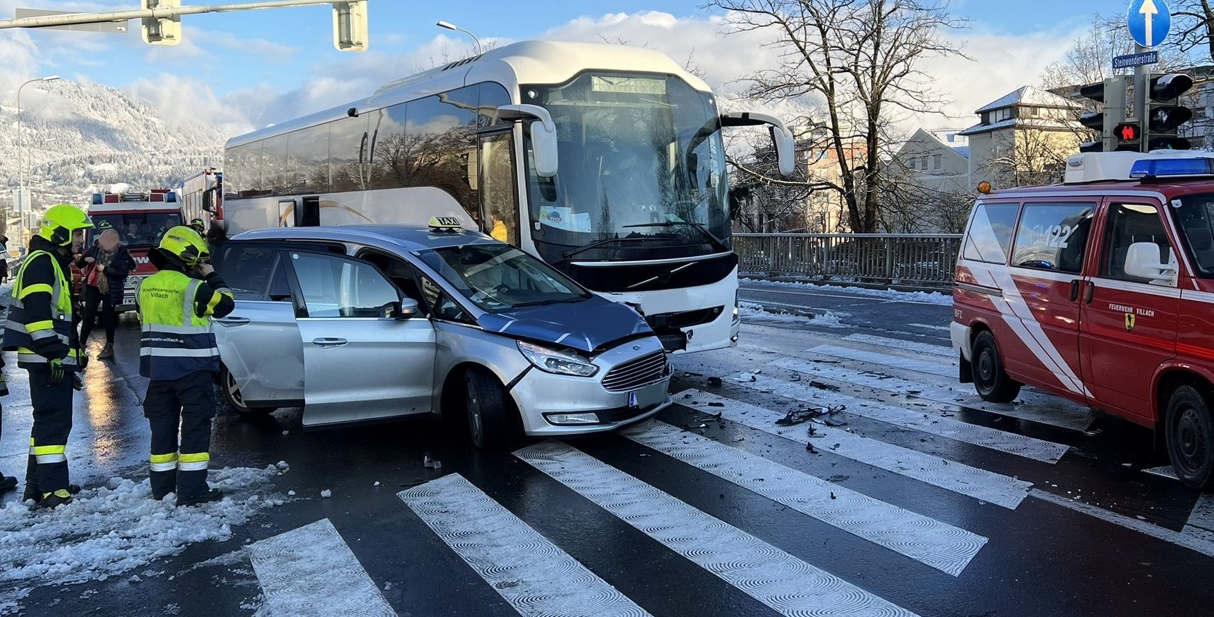 An der Einsatzstelle konnte nach dem Eintreffen der ersten Einsatzkräfte unseres technischen Zuges festgestellt werden, dass ein Reisebus und ein Taxi aus noch unbekannter Ursache miteinander kollidiert waren, so Einsatzleiter HBI Harald Geissler, Kommandant der Hauptfeuerwache Villach.