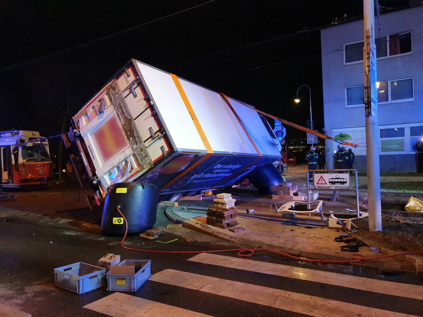 Eine LKW-Lenker biegt unmittelbar vor einer herannahenden Straßenbahngarnitur ab. Die Straßenbahn rammt den LKW, der Lastwagen stürzt um. Der Fahrer wird in der Fahrerkabine eingeschlossen und dabei unbestimmten Grades verletzt. In der Straßenbahn gibt es vier Leichtverletzte.