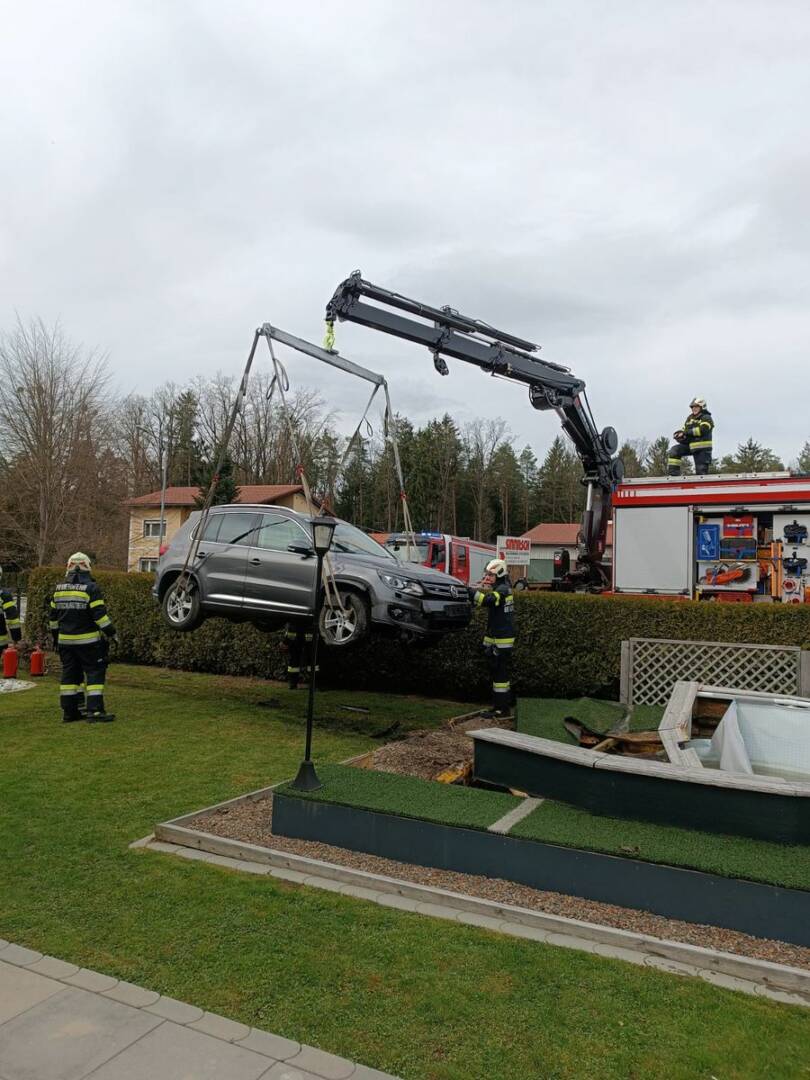 Die Feuerwehren St. Peter im Sulmtal und Deutschlandsberg zogen das stark beschädigte Fahrzeug aus dem Pool. Danach wurde der Wagen mit Hilfe eines Krans vom Grundstück gehoben. 15 Feuerwehrleute waren bei den Berge- und Aufräumarbeiten im Einsatz. Sowohl am Pkw als auch am Pool dürfte Totalschaden entstanden sein. heißt es von der Polizei.