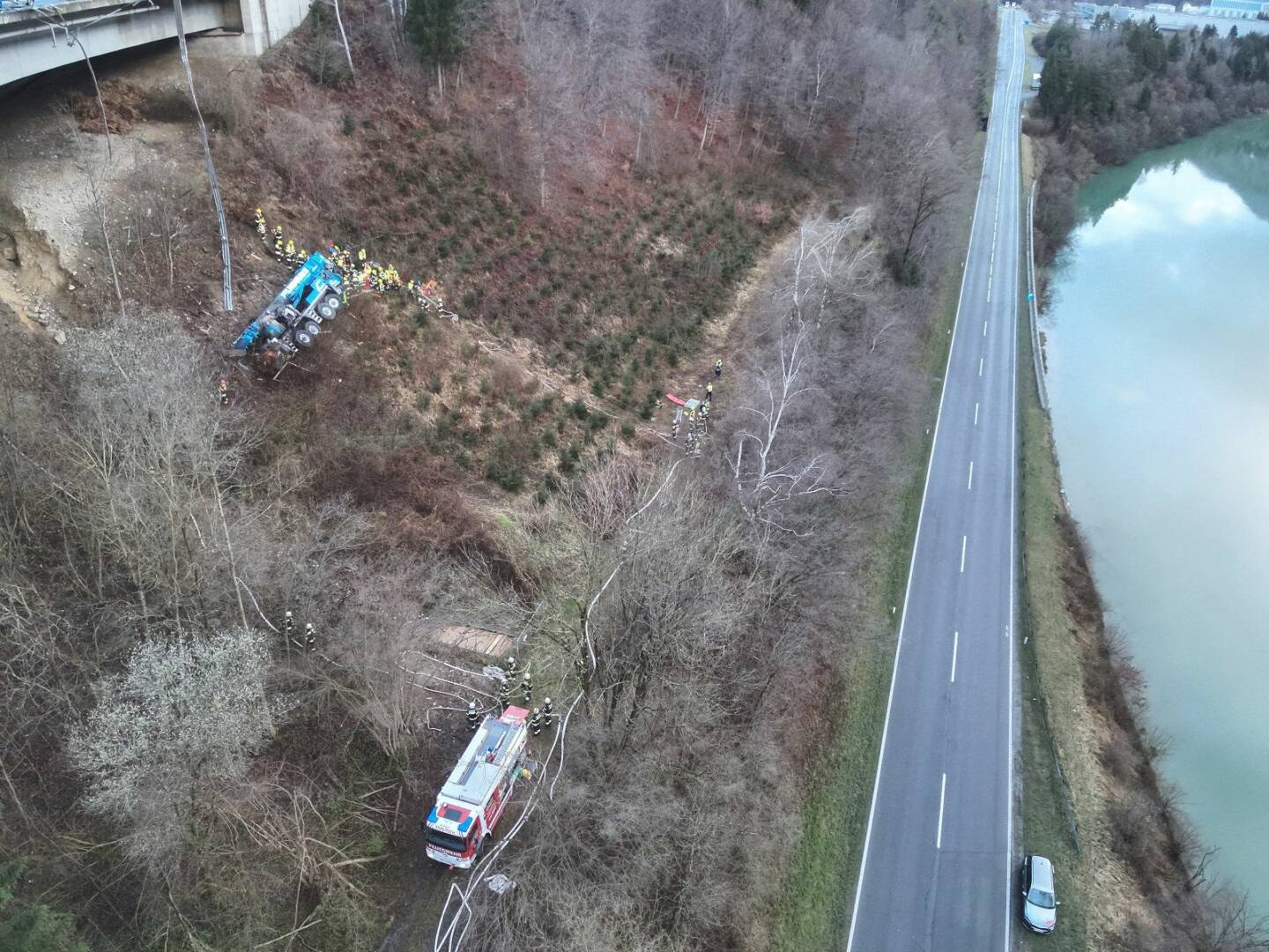Zum Aufbau einer stabilen Wasserversorgung aus dem naheliegenden Drau Fluss wurden die Freiwilligen Feuerwehren Puch, St. Martin, Pogöriach und Möltschach seitens der Leitstelle Villach verständigt. Parallel dazu wurde durch das Rüstlöschfahrzeug der Hauptfeuerwache die Personenrettung des eingeklemmten Fahrers mittels schweren technischen Gerätes vorgenommen, berichtete Einsatzleiter HBI Harald Geissler, Kommandant der Hauptfeuerwache Villach.