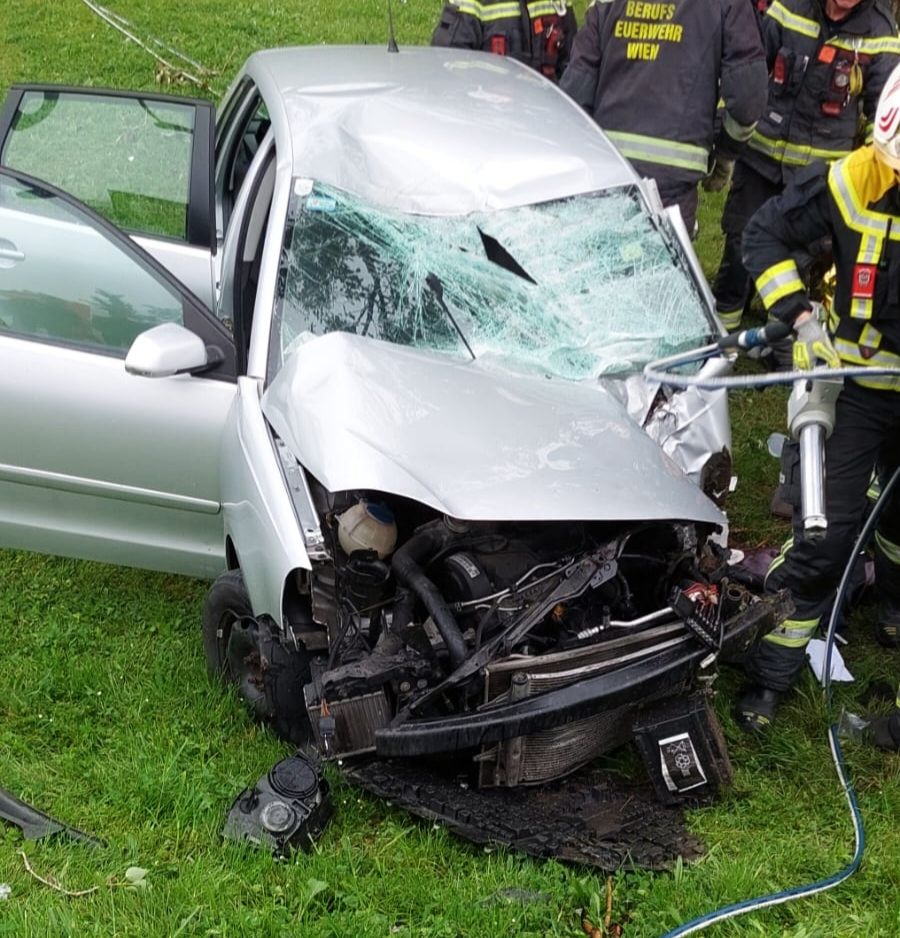 Der Anprall am Baum war dermaßen heftig, dass die Fahrertüre abgerissen wurde. Die Lenkerin, die sich alleine im Fahrzeug befand, wurde eingeklemmt und schwer verletzt. Von den alarmierten Feuerwehrleuten wurde der Vorbau mit einem hydraulischen Stempel so weit weggedrückt, dass die Lenkerin geborgen werden konnte. Sie wurde von der Berufsrettung Wien notfallmedizinisch versorgt und in ein Krankenhaus gebracht. Die Feuerwehr entfernte das Fahrzeugwrack mit einem Abschleppfahrzeug.