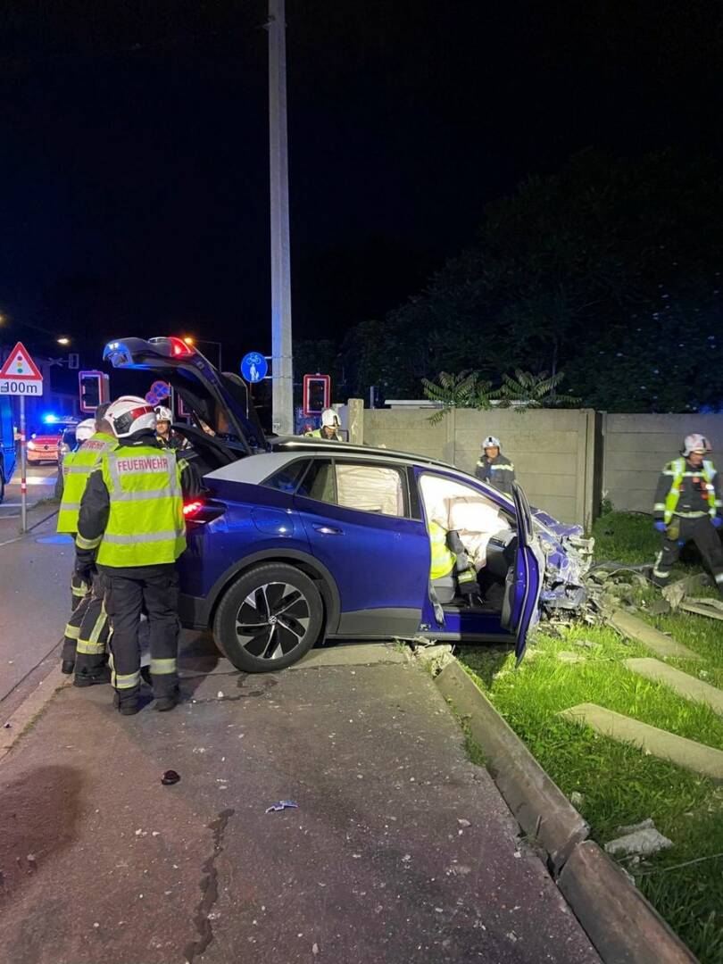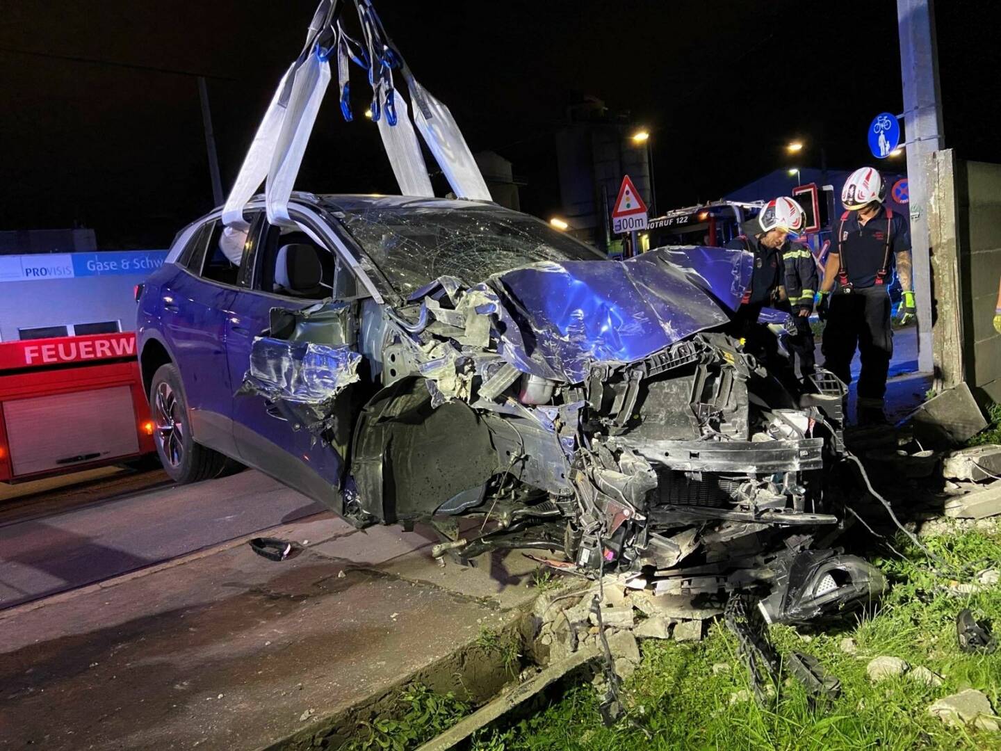 Die ersteingetroffenen Feuerwehrkräfte konnten bei der Erkundung feststellen, dass bereits beide Insassen vom Rettungsdienst betreut wurden und dass es sich beim Unfallfahrzeug um einen PKW mit Elektroantrieb handelt. Daher wurden in weiterer Folge mittels Schnellangriffseinrichtung (Löschleitung) ein Brandschutz aufgebaut und mittels Wärmebildkamera die Fahrzeug-Akkus auf Erwärmung kontrolliert und die Einsatzstelle mit Lichtflutern ausgeleuchtet.