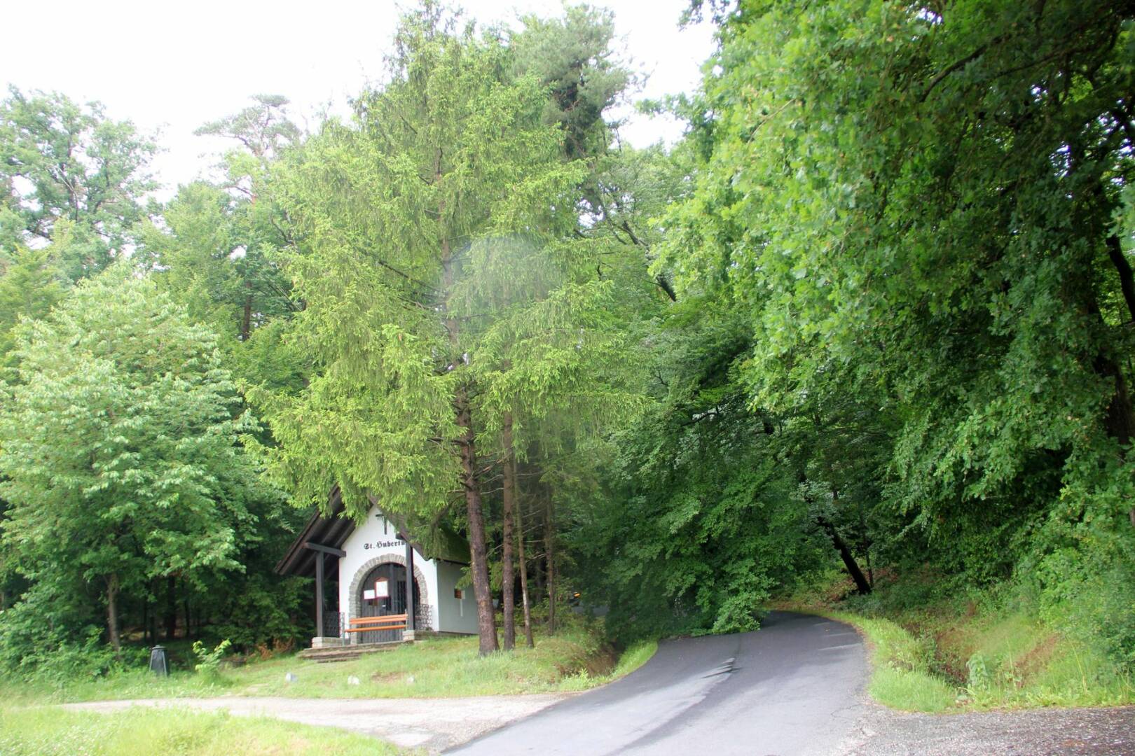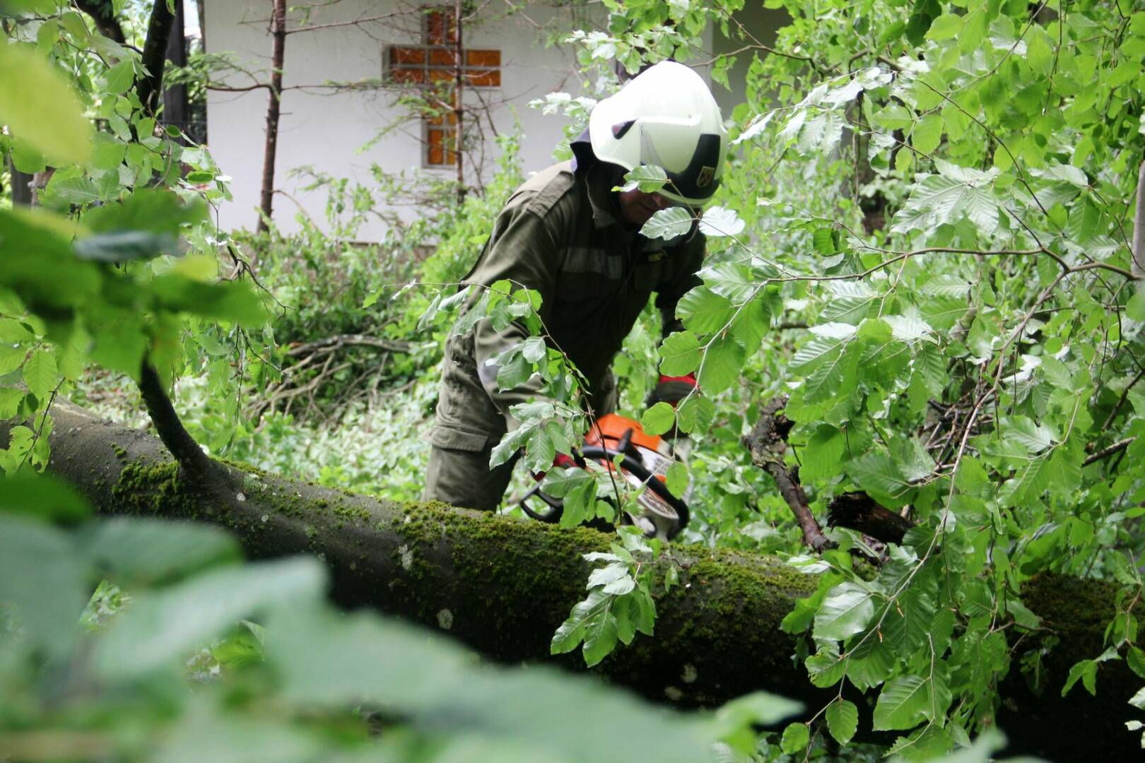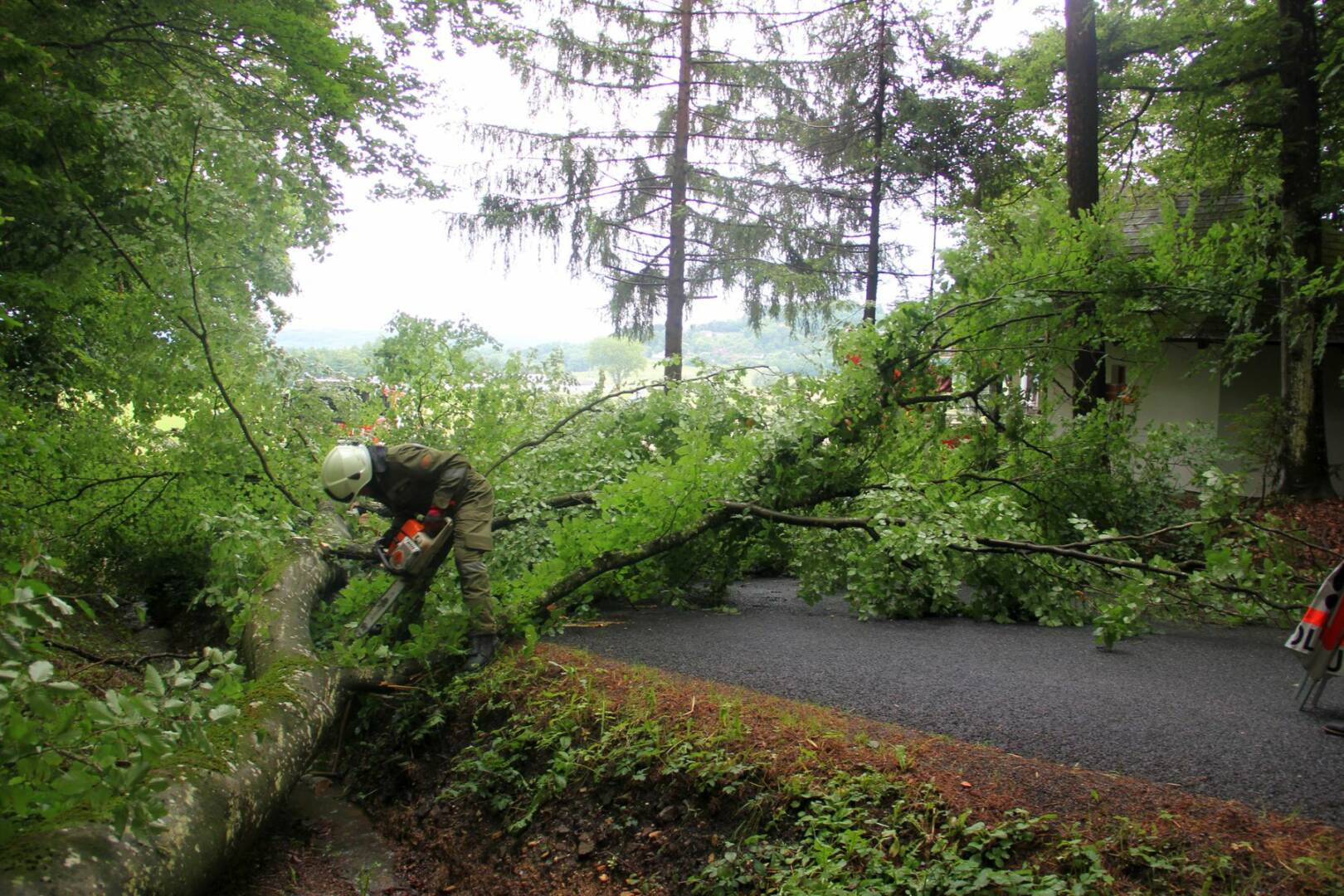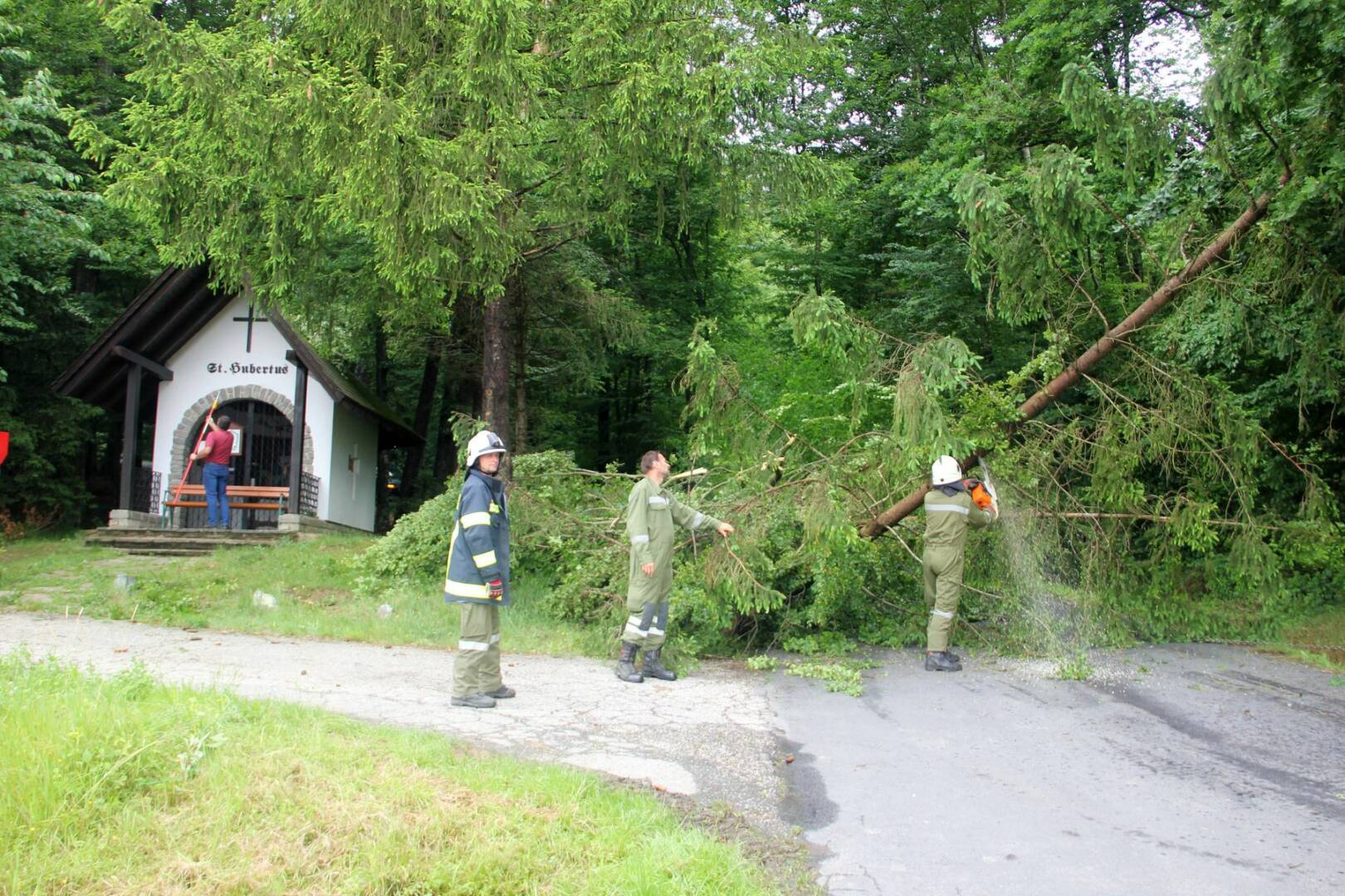 Durch die starken Regenfälle war eine 30 Meter hohe Eiche entwurzelt worden und blieb genau über dem Dach der Hubertuskapelle in einer Astgabel hängen. Ein aufmerksamer Autofahrer bemerkte die brenzlige Situation und alarmieret Polizei und Feuerwehr.