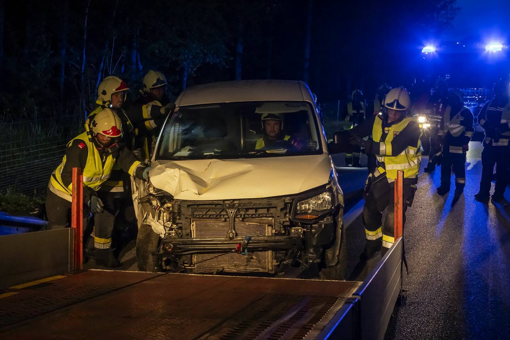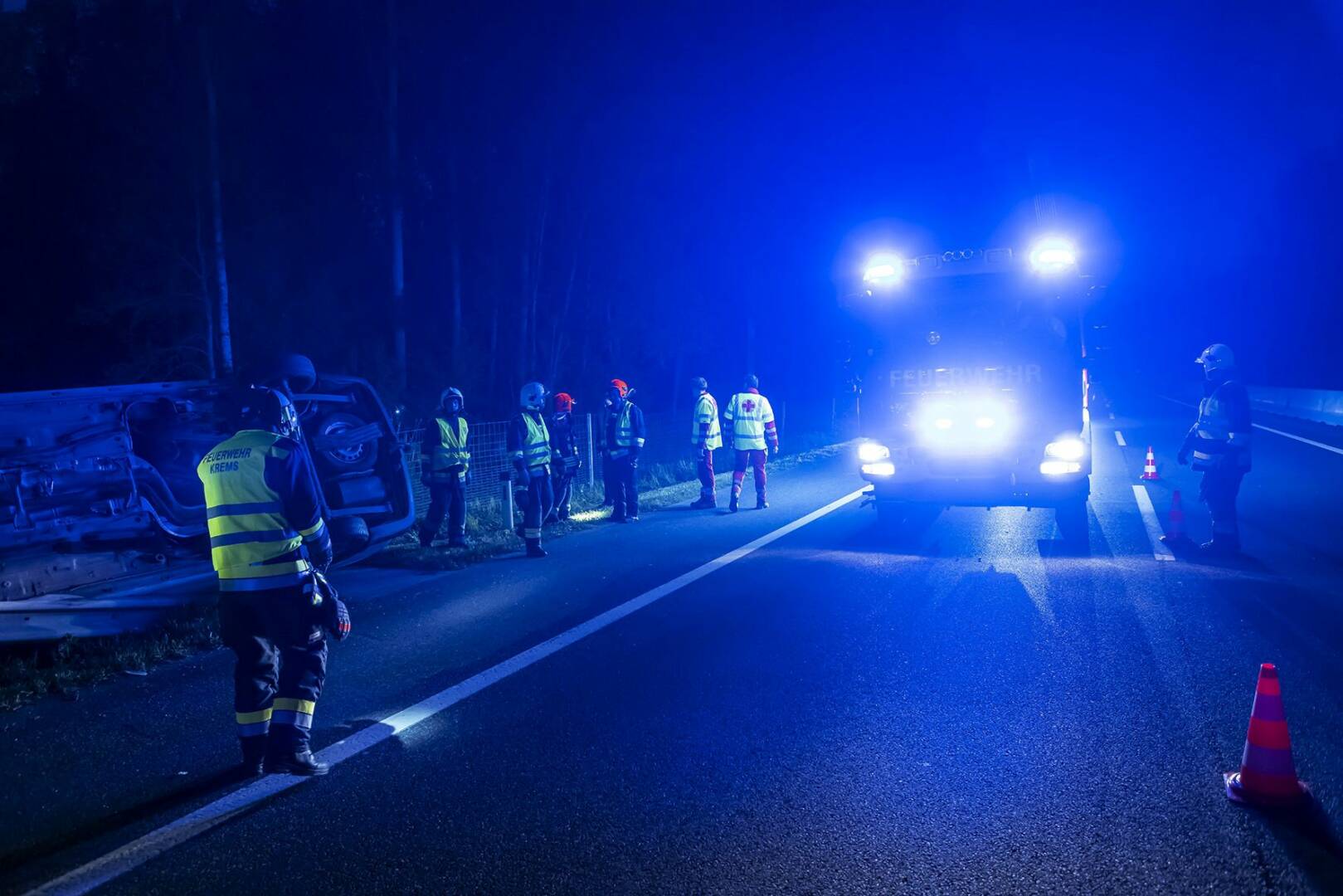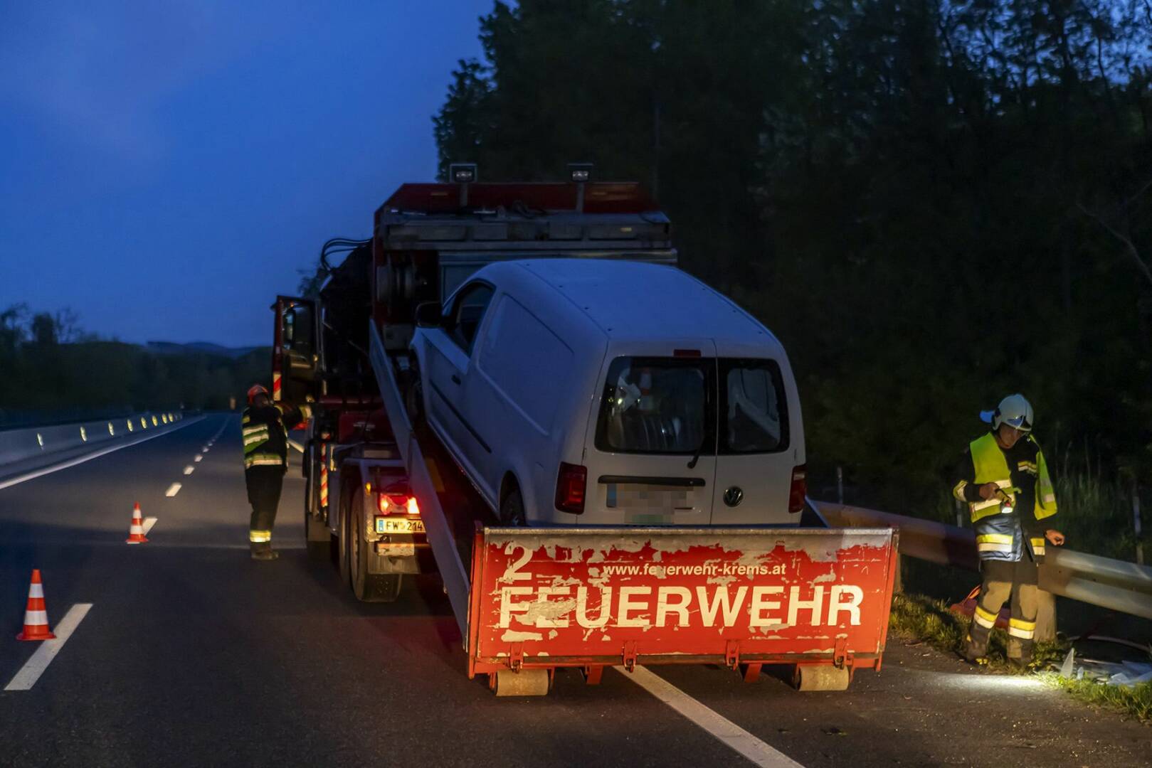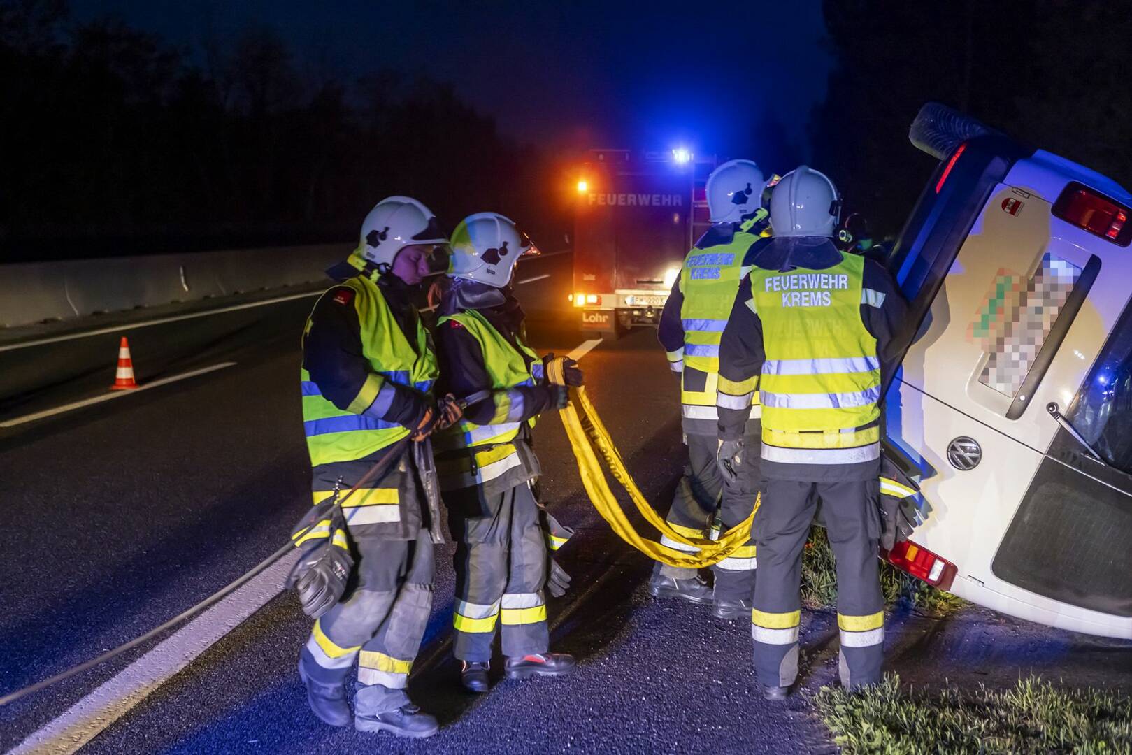 Bei Ankunft der Einsatzkräfte der Feuerwache Krems-Süd und Hauptwache waren die Autobahnpolizei und der Rettungsdienst bereits vor Ort. Obwohl die Polizei den Bereich bereits abgesichert hatte, wurden zusätzliche Leitkegel aufgestellt, um die Zone weiter zu sichern. Nachdem überprüft wurde, dass sich niemand mehr im Fahrzeug befand, stellten die Einsatzkräfte fest, dass der Fahrer die Unfallstelle verlassen hatte. Eine Suche im Nahbereich blieb erfolglos.