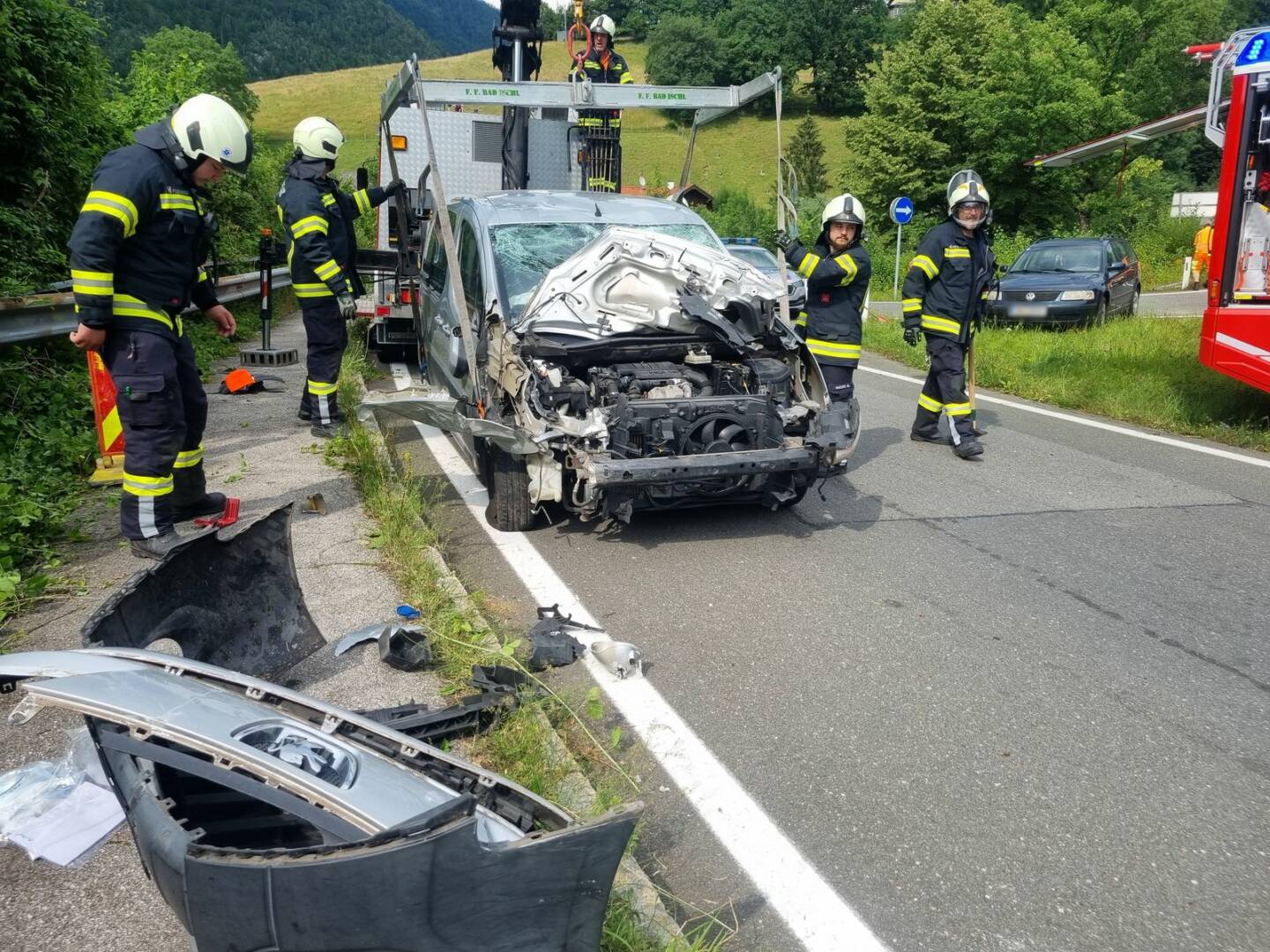 Nachdem man die verletzte Person ins LKH Bad Ischl abtransportiert hatte, begann man mit der Fahrzeugbergung mittels Kran, sowie den Aufräumarbeiten der Unfallstelle. Die Straßenmeisterei Bad Ischl unterstützte die Aufräumungsarbeiten ebenfalls und sorgte für die Absicherung der Unfallstelle. Die Aufnahme des Schadensereignisses erfolgte durch eine Streife der Bundespolizei.