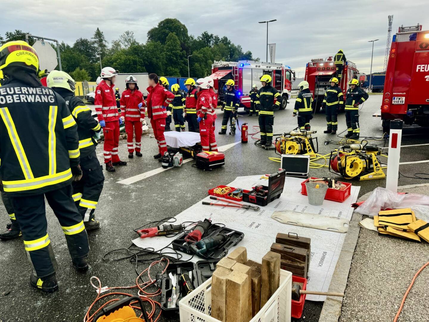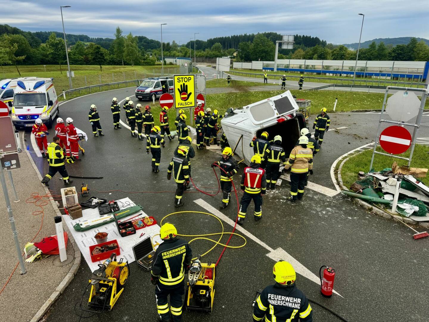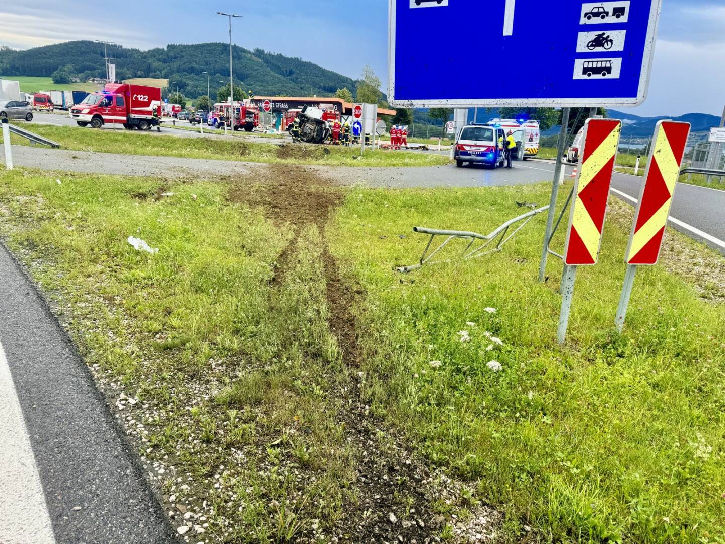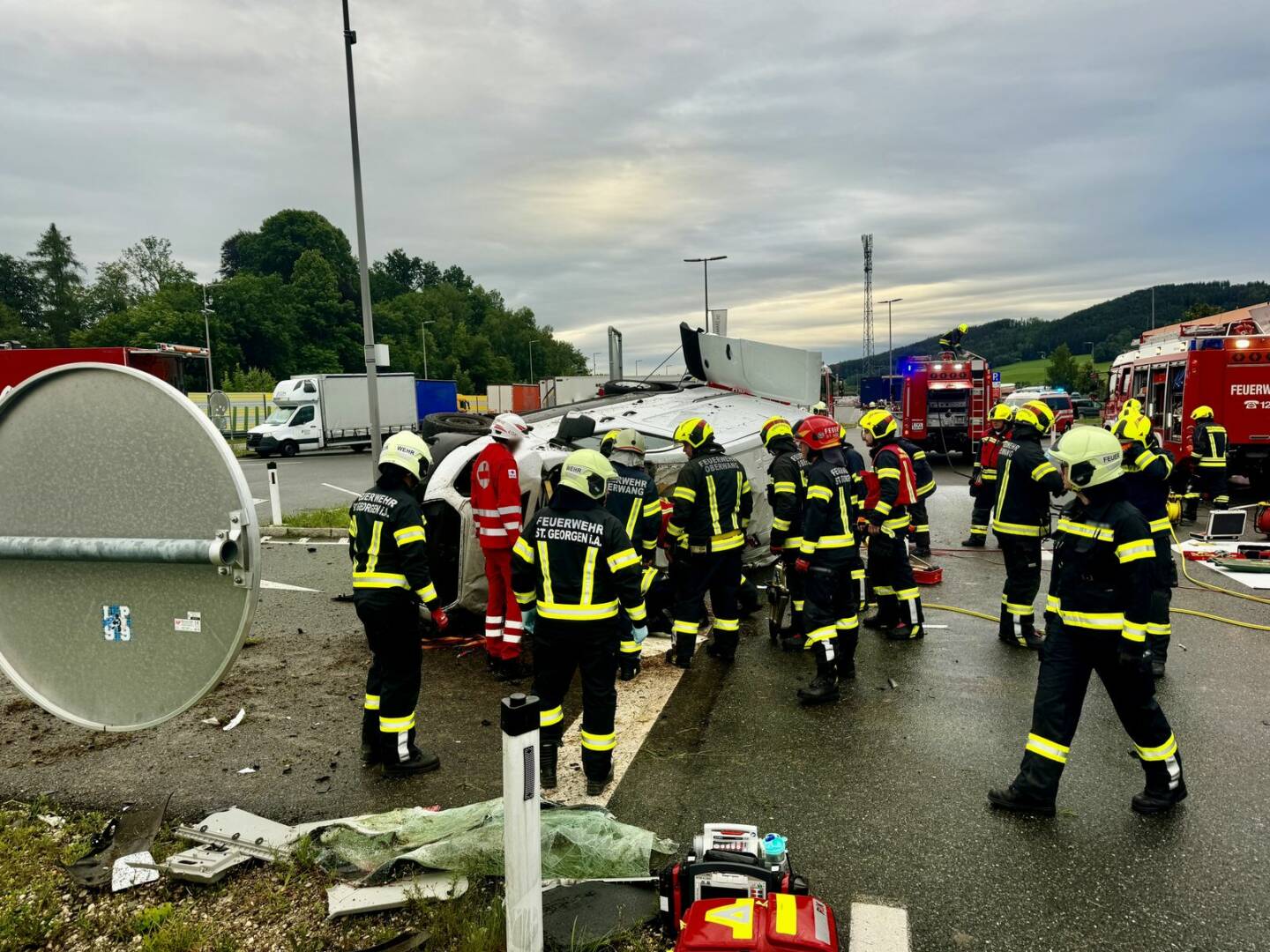 Am Sonntag, den 7. Juli 2024, wurden die Feuerwehren Oberwang, Innerschwand und St. Georgen im Attergau um 6.04 Uhr zu einem schweren Verkehrsunfall mit eingeklemmter Person alarmiert. Eine Lenkerin war mit ihrem Fahrzeug bei der Einfahrt zum Rastplatz Straß von der Fahrbahn abgekommen und hatte sich am Parkplatz überschlagen.