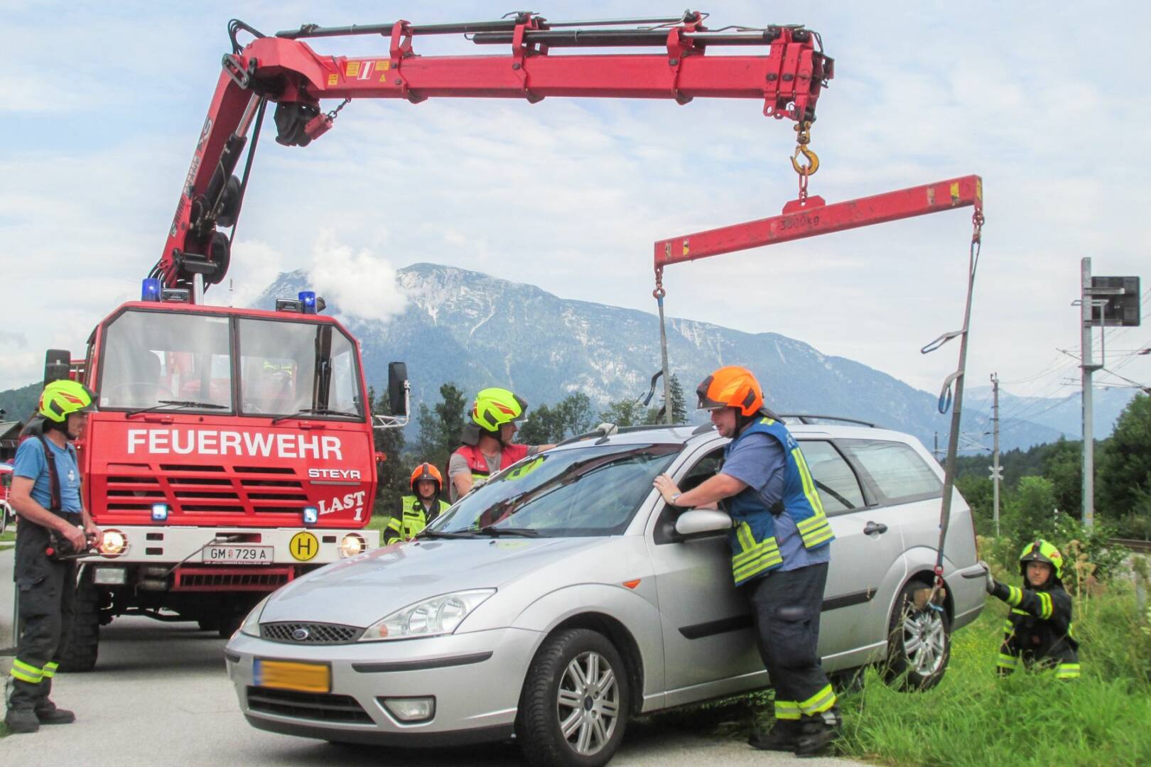Eigentlich wollte ein Urlaubsgast gegen Abend des 20. Juli 2024 nur den PKW in der Sophienbrückenstraße wenden, als das Fahrzeug beim Rückwärtsfahren jedoch über den Straßenrand hinausgeraten war. In der Folge saß der Kombi auf der Bodenplatte fest. Zu Hilfe kamen schließlich die Kräfte der FF Bad Goisern, die in routinierter Weise mittels Bergekran das Fahrzeug behutsam anhoben und wieder auf die Straße hievten.