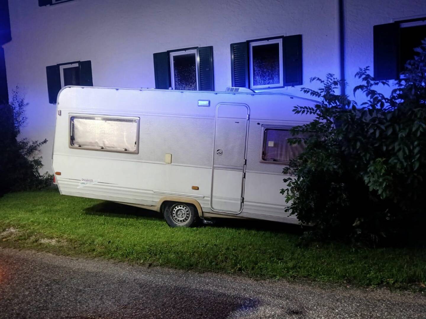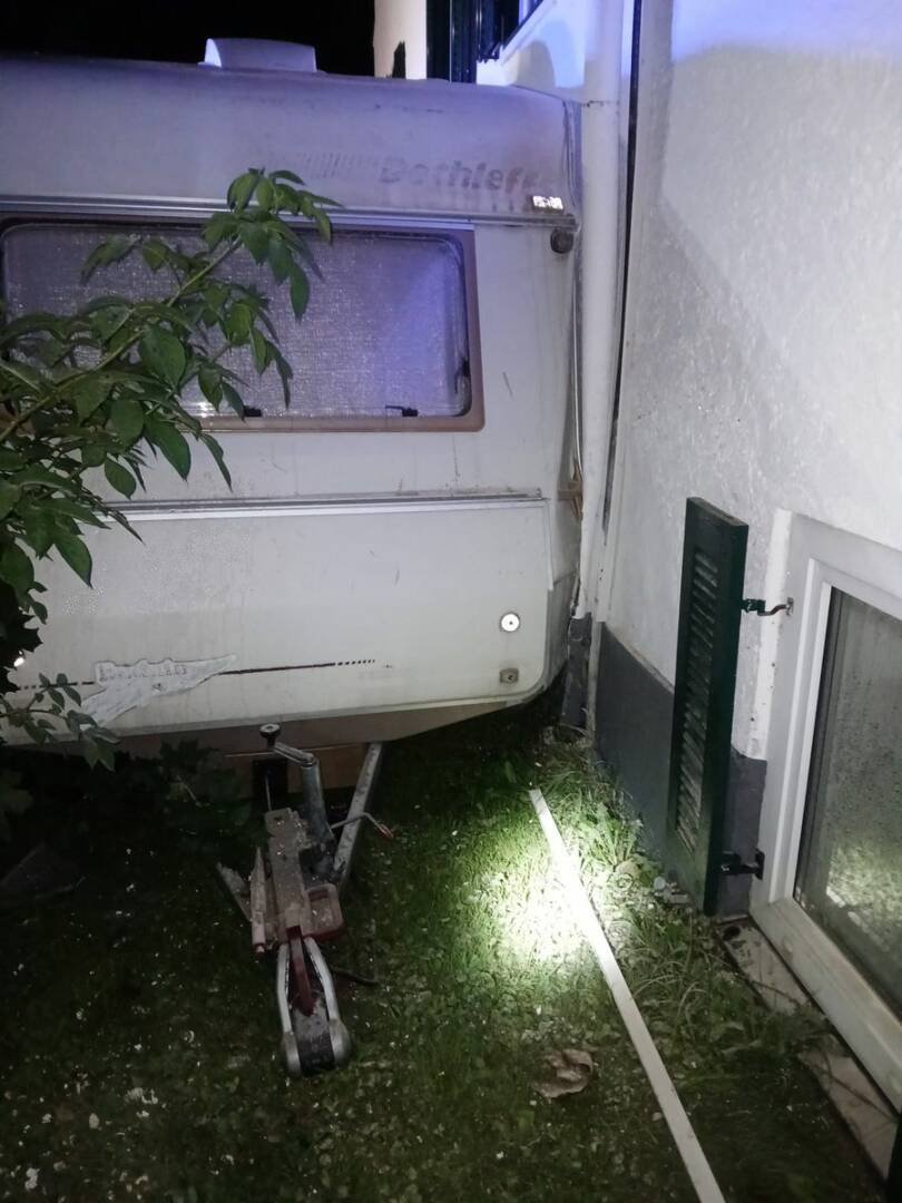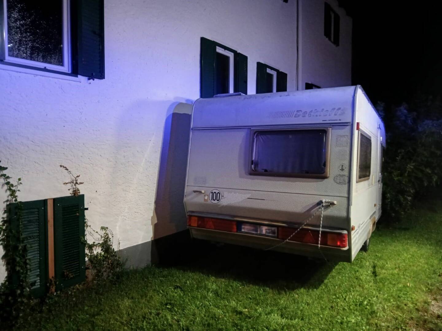 Aufgrund eines technischen Gebrechens löste sich der Wohnwagen vom PKW, überholte ihn und krachte in ein Haus. Zum Glück wurden keine Personen verletzt und es entstand nur geringer Sachschaden.