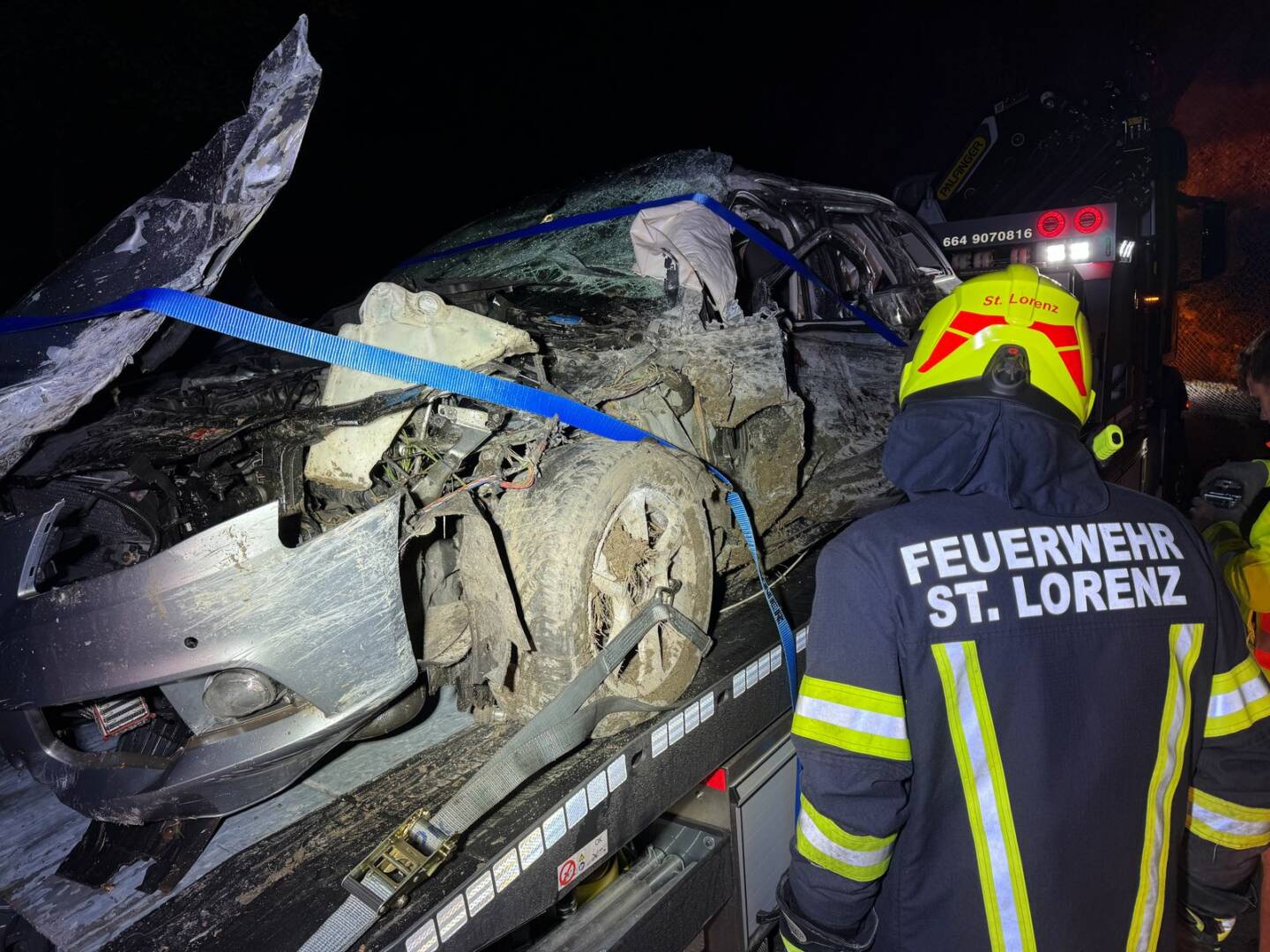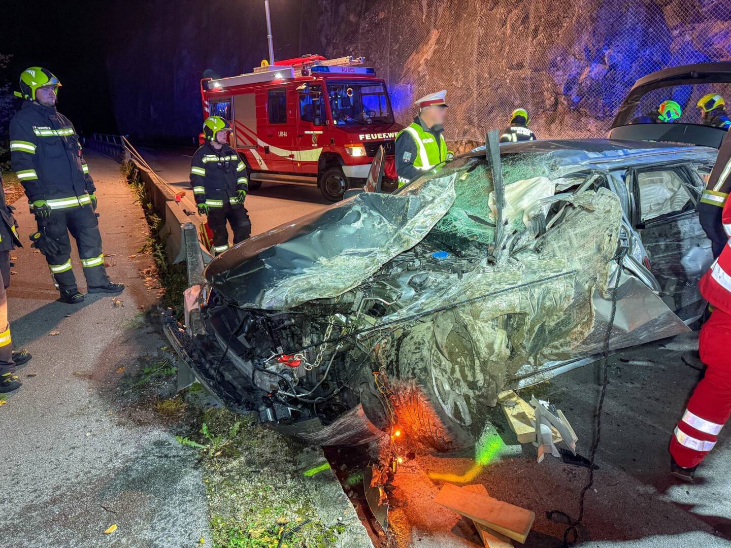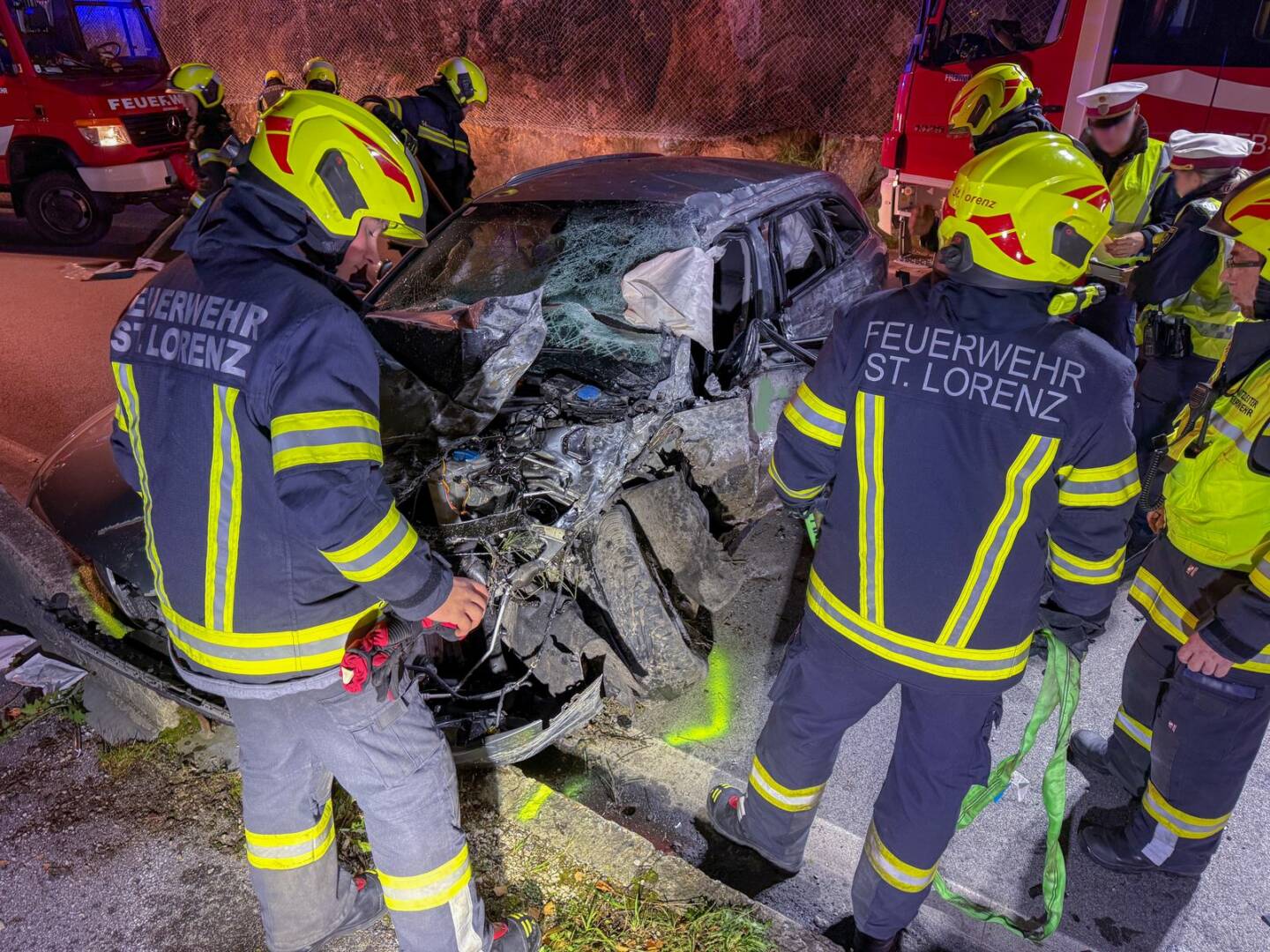 Ein von Scharfling kommender PKW war gegen die Felswand geschleudert. Durch die Wucht des Aufpralls wurde die linke Fahrzeugseite massiv deformiert. Das Fahrzeug kam auf der anderen Straßenseite bei den Betonleitschienen vor dem Seeufer zum Stehen. Der Einsatzleiter der Feuerwehr St. Lorenz, Stefan Sturm, schilderte die Lage beim Eintreffen: „Im stark verformten Unfallfahrzeug war der Lenker eingeklemmt, die anderen drei Insassen konnten das Fahrzeug zwar verletzt, aber selbständig verlassen!“