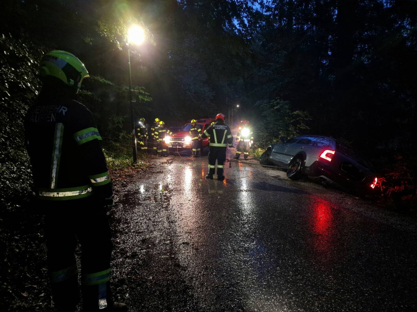 Am Sonntag, den 15.09.2024, wurden die Kameraden der Feuerwehr Lauffen in die Engleitenstraße zu einem Verkehrsunfall alarmiert. Von den Freiwilligen wurde ein Auto, welches von der Fahrbahn abzustürzen drohte, vorgefunden.