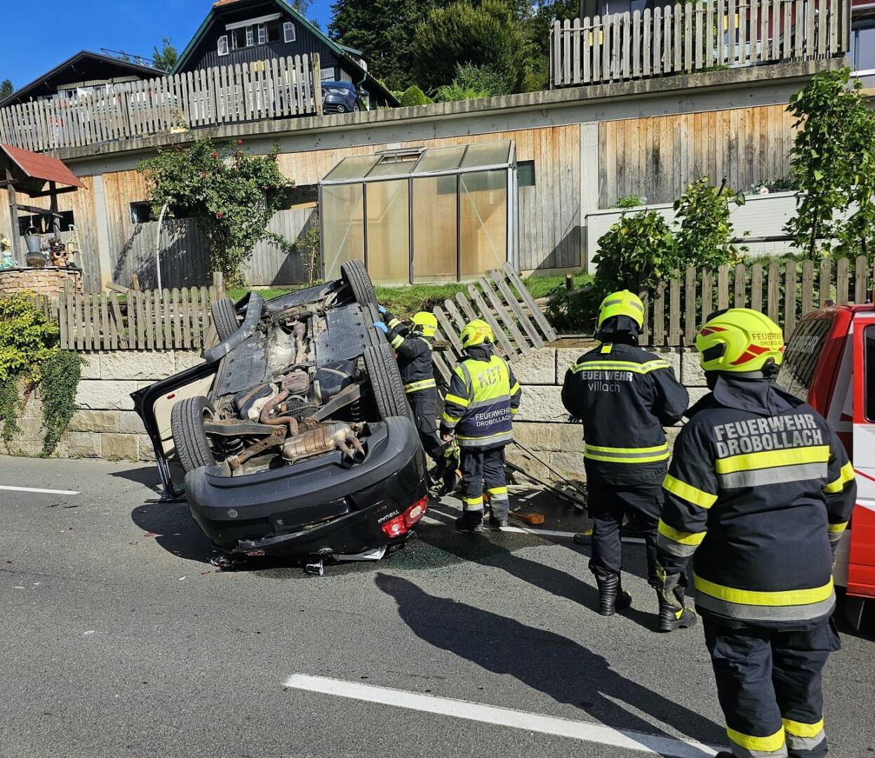 Kurz vor 15:30 Uhr wurde der Feuerwehrleitstelle Villach ein spektakulärer PKW-Unfall auf der B84 Seeblickstraße in Egg am Faakersee gemeldet. Ein PKW war aus noch unbekannter Ursache von einem Parkplatz oberhalb der Bundesstraße abgestürzt, hatte sich überschlagen und blieb seitlich auf der darunter liegenden Stützmauer und teilweise auf der Fahrbahn am Dach liegen. Die Insassen sollten sich noch im Fahrzeug befinden. Näheres war nicht bekannt.