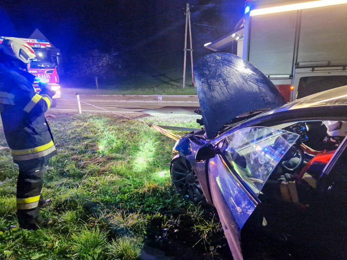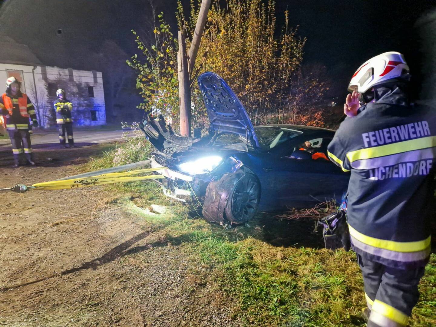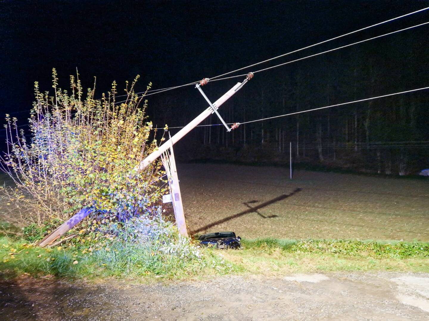 E-PKW touchierte Strommast │ © Thomas Mahler / FF St. Stefan/R
