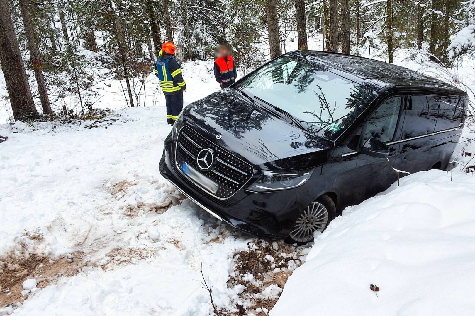 Nur mit aufgezogenen Schneeketten an den Einsatzfahrzeugen konnten die Feuerwehrkräfte den Einsatzort erreichen, der sich knapp unterhalb der Trockentannalm befand. Unter Einsatz des Bergekrans sowie einer Seilwinde mitsamt Umlenkrolle gelang es den Kräften schließlich, das Fahrzeug wieder auf die Straße zu bergen. Rückgesichert an einem Feuerwehrfahrzeug wurde der Kleinbus folglich noch talwärts aus dem Steilstück begleitet.
