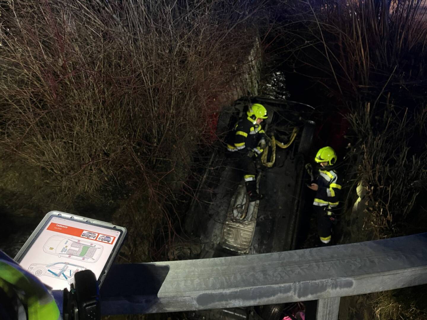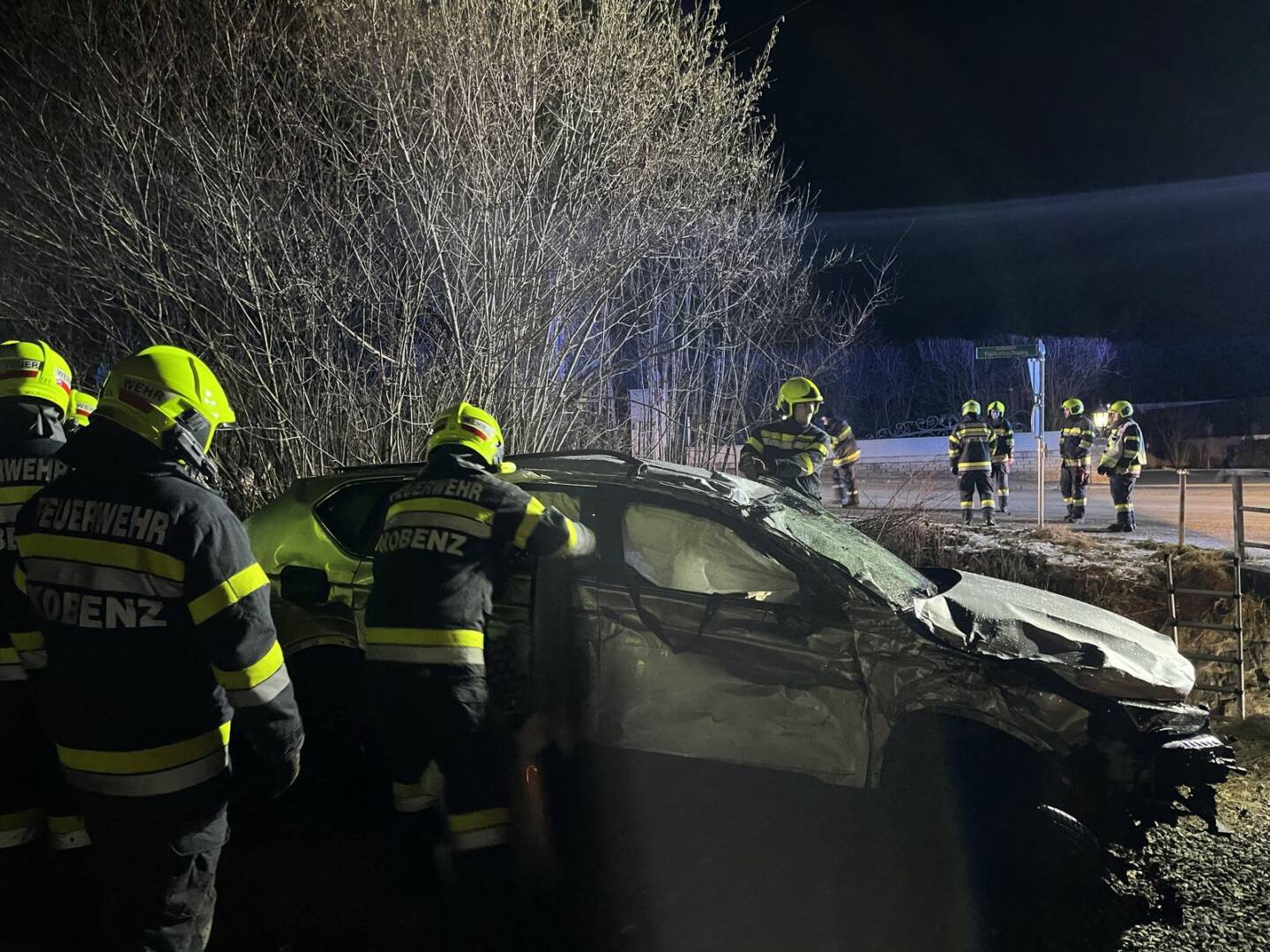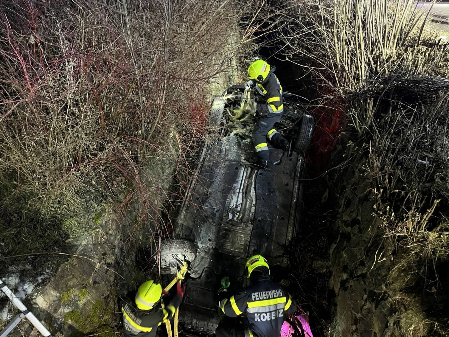 Beim Eintreffen stellte der Einsatzleiter OBI Gerhard Mayer fest, dass sich keine Personen mehr im Fahrzeug befanden, jedoch sich noch verletzt im Bachbett aufgehalten haben. Nachdem die Personen mit einer Steckleiter aus dem Bachbett gerettet wurden, konnten sie dem anwesenden Notarzt übergeben und mit Verletzungen unbestimmten Grades ins nächstgelegene Krankenhaus transportiert werden.