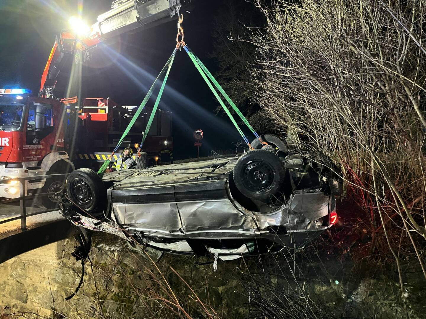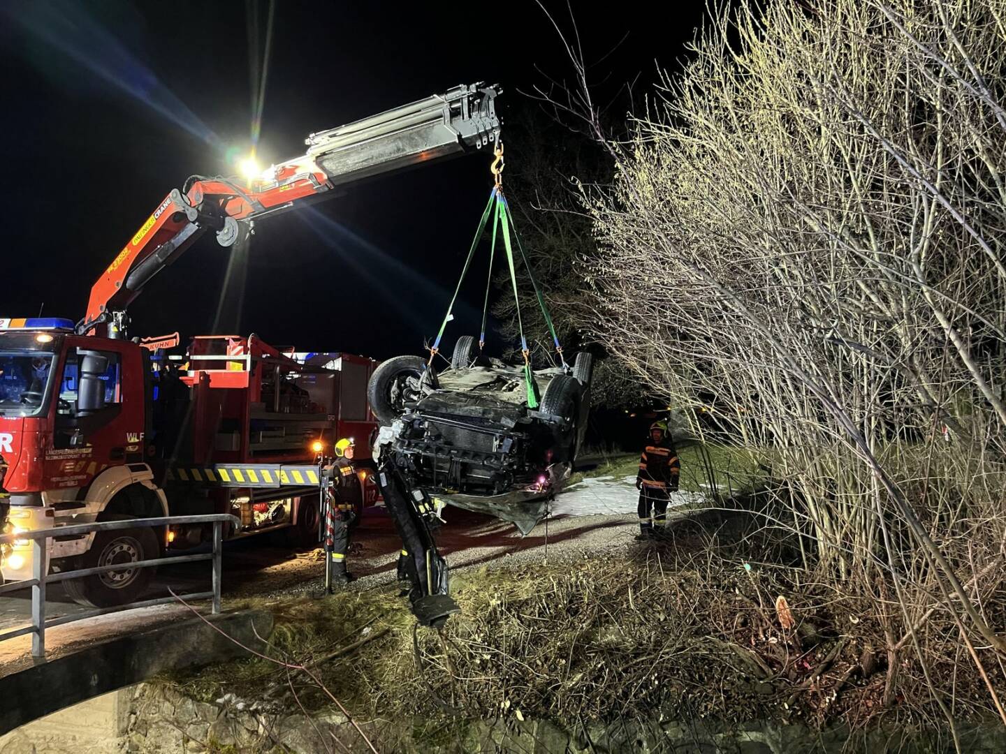 Zeitgleich zur Personenrettung wurde die Unfallstelle abgesichert und großräumig ausgeleuchtet. Abschließend wurde der PKW mit dem Kran aus dem Bachbett gehoben und die Unfallstelle von Kleinteilen gereinigt.