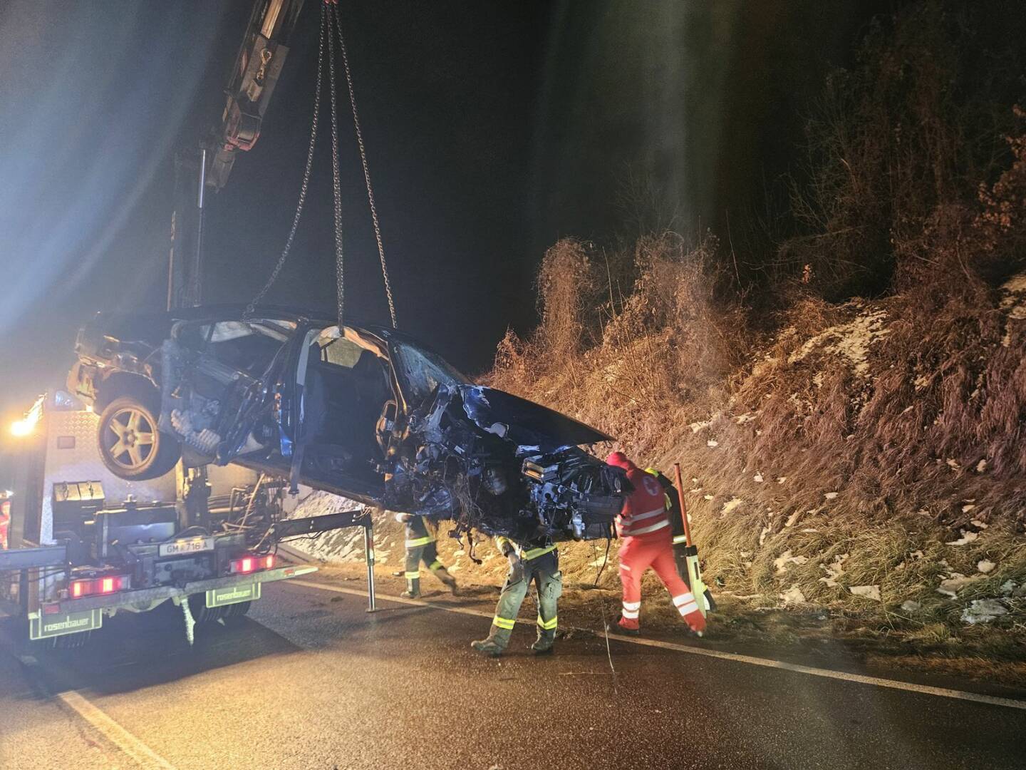 Für die Florianis galt es die Straße von ausgetretenen Betriebsmitteln und Fahrzeugteilen zu reinigen. Im Anschluss wurde das zerstörte Auto einem Abschleppunternehmen übergeben.