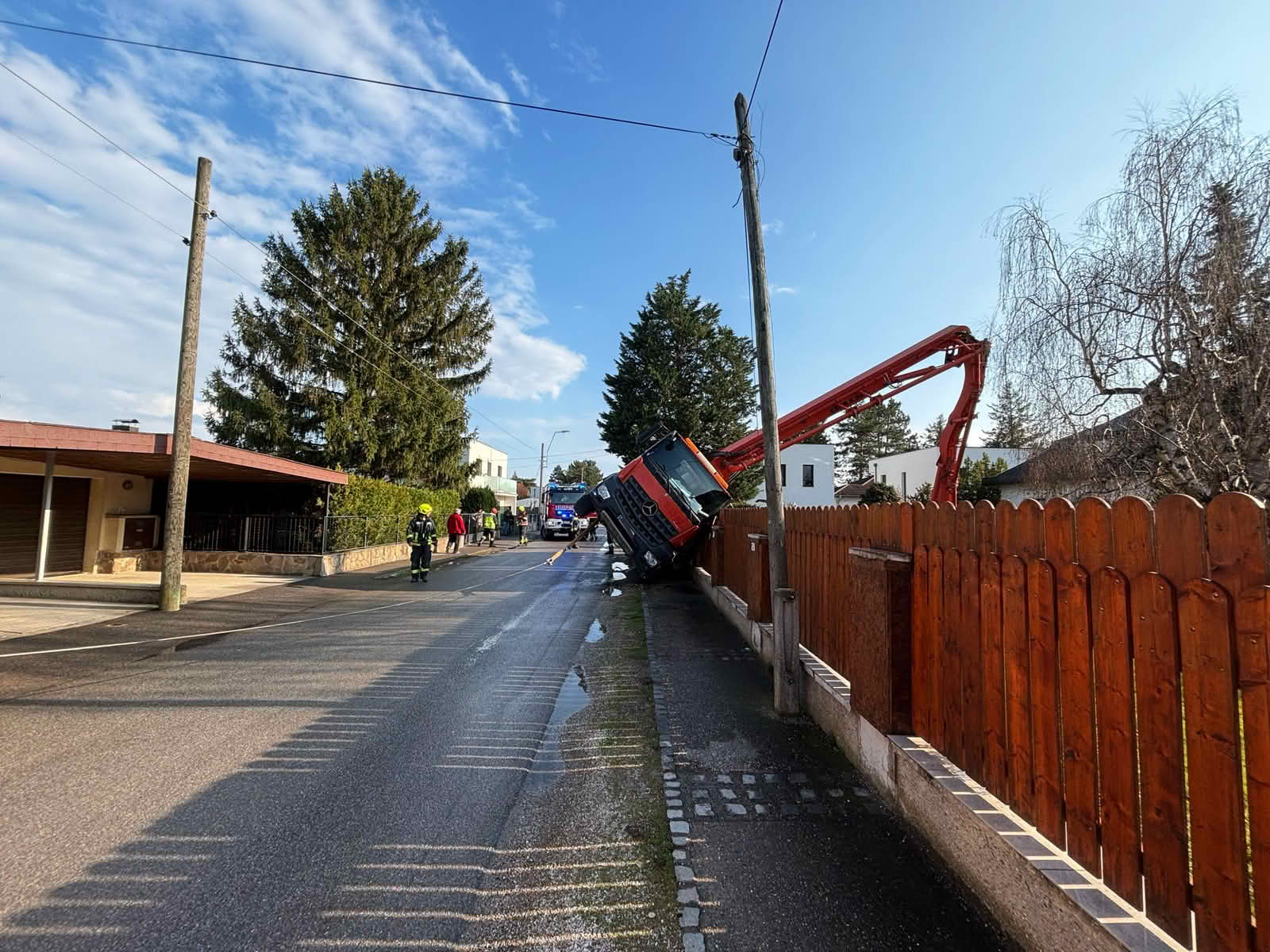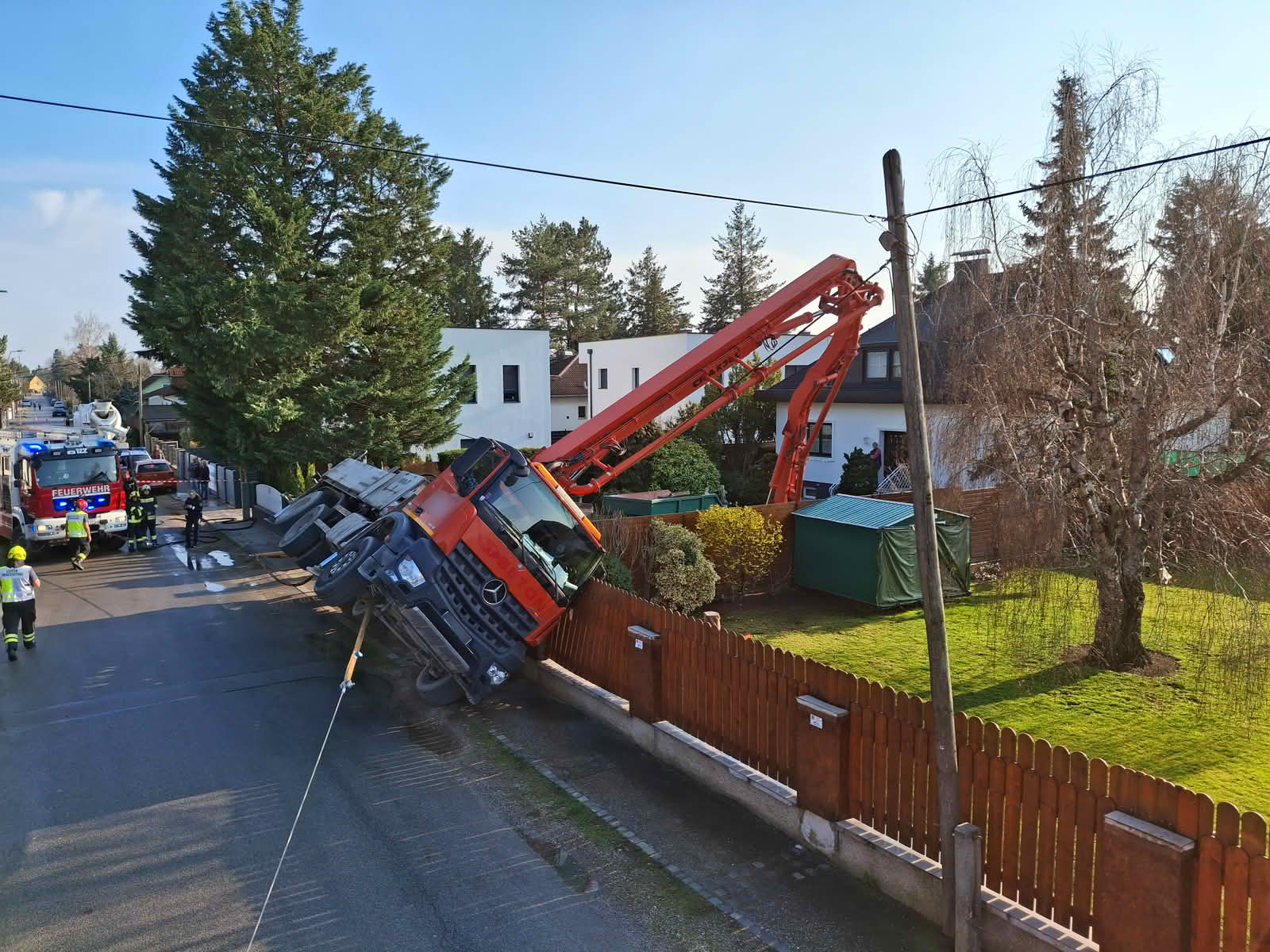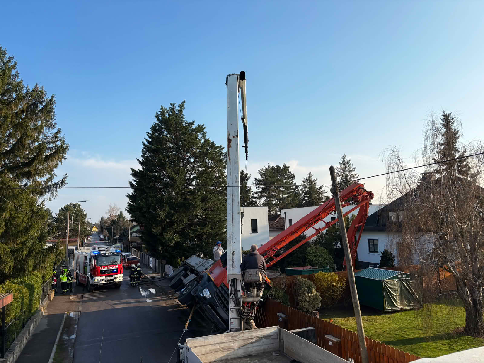 Die Betonpumpe verfing sich mit seinem Ausleger in einer Telefonleitung und begrub zudem einen Verteilerkasten unter sich. Daraufhin wurden der Störungsdienst der Netze NÖ verständigt.