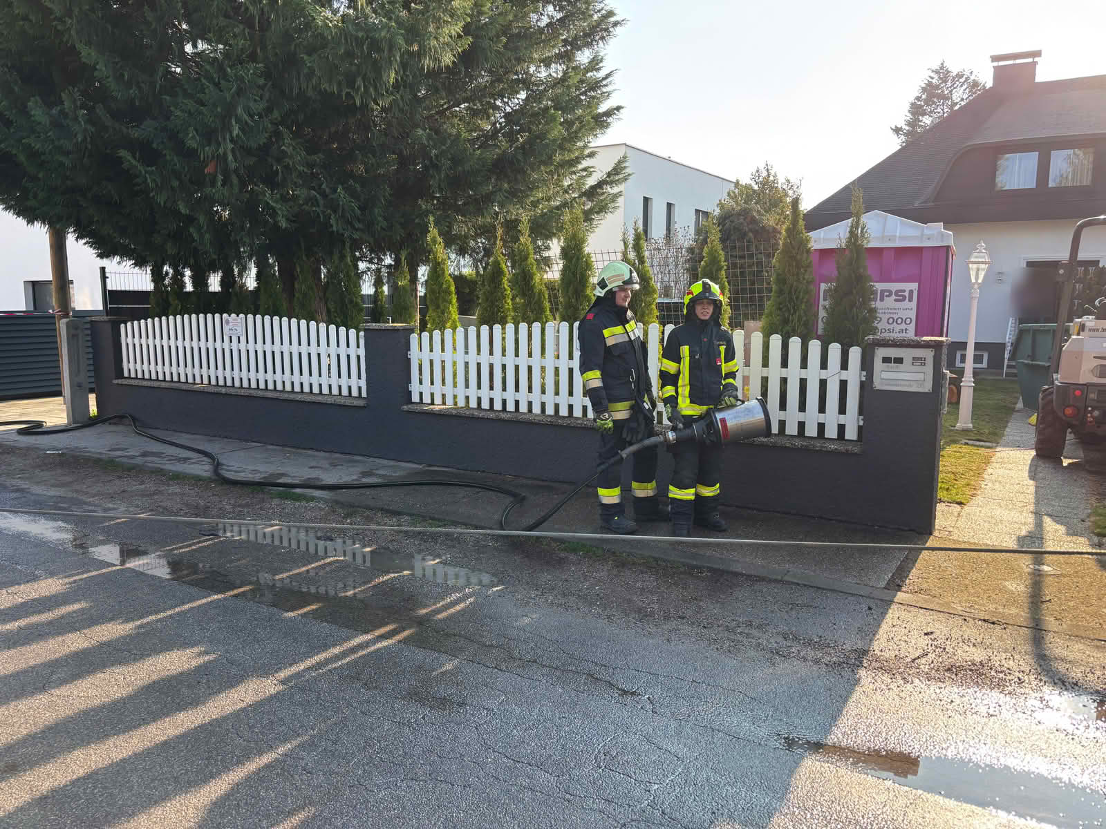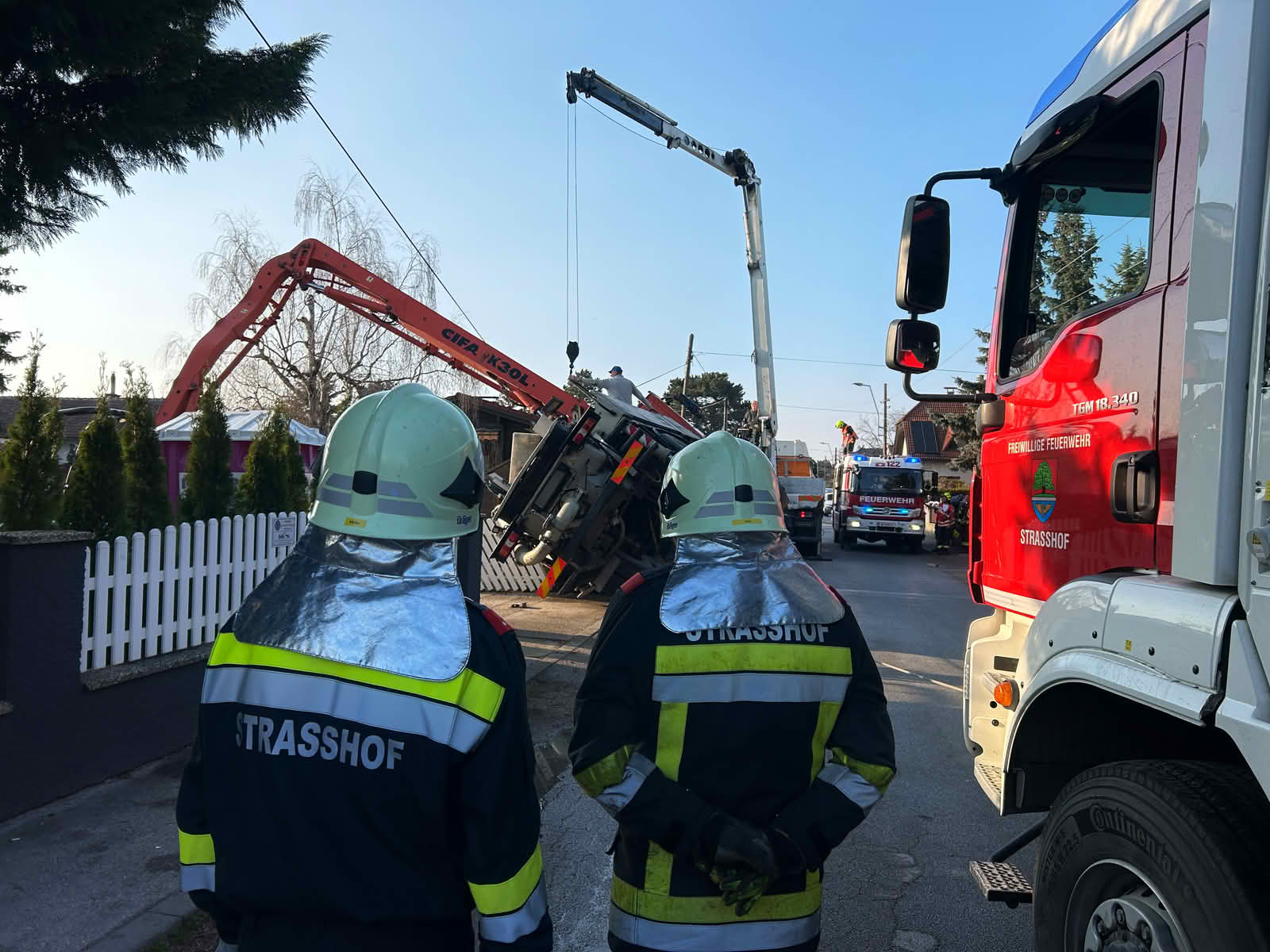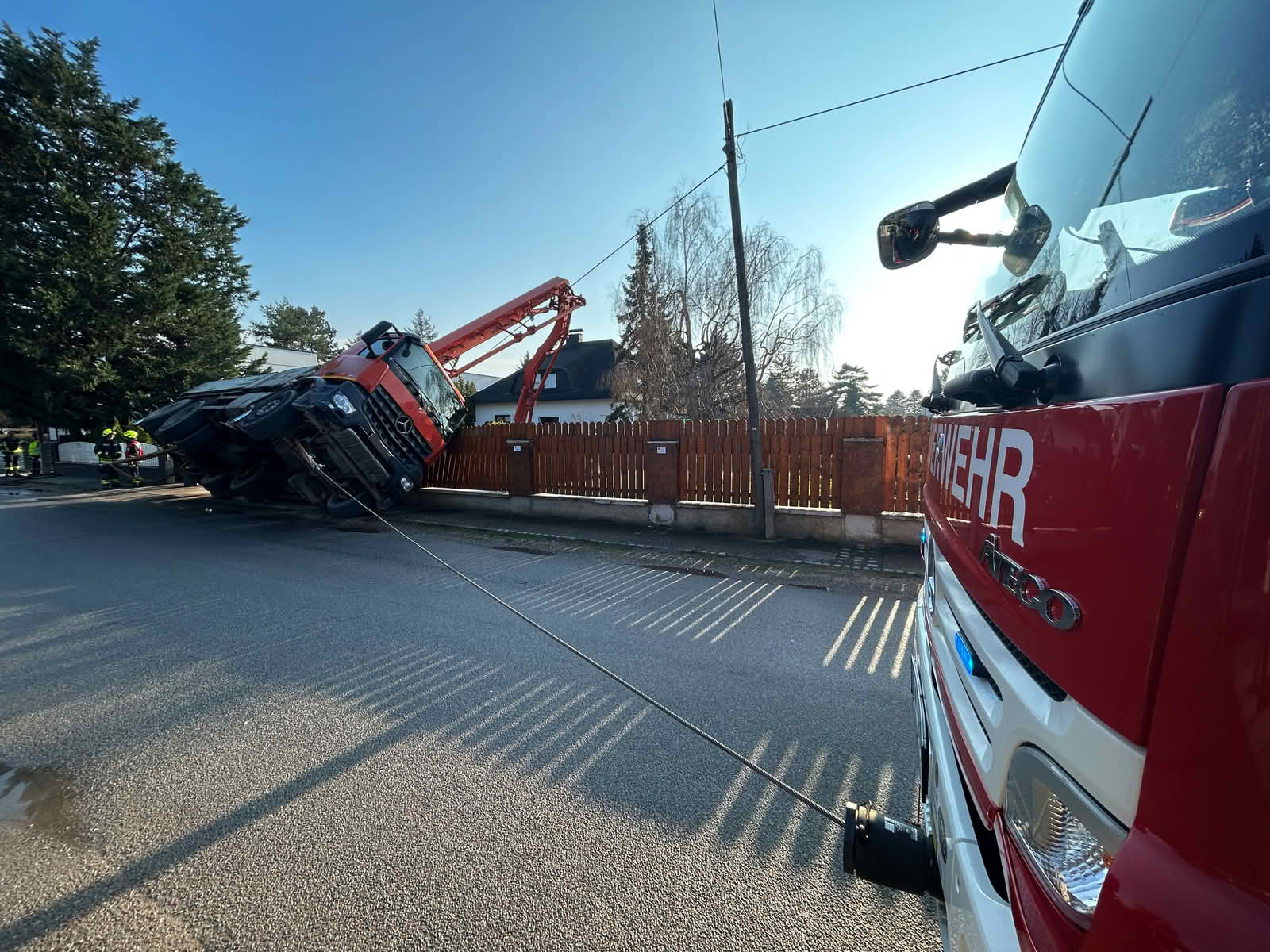 Die Betonpumpe verfing sich mit seinem Ausleger in einer Telefonleitung und begrub zudem einen Verteilerkasten unter sich. Daraufhin wurden der Störungsdienst der Netze NÖ verständigt.