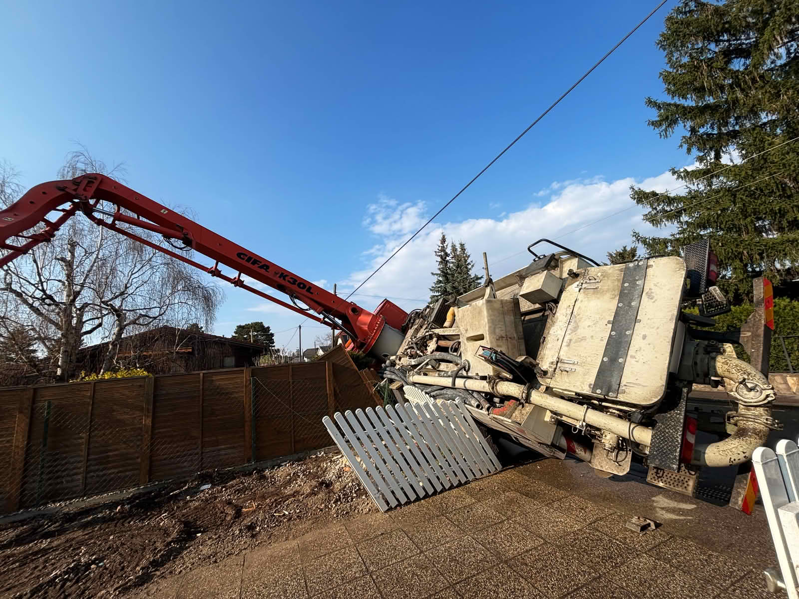 Aus bisher ungeklärter Ursache kippte ein Betonmischer seitlich um und kam in Schräglage auf dem Gartenzaun zweier Grundstücke zum Stillstand.