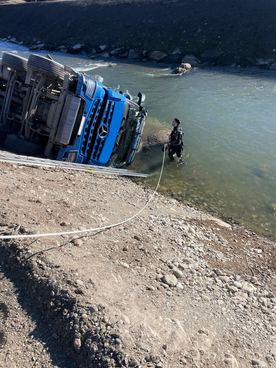 Ein 4-Achs-LKW ist bei der Rückwärtsfahrt vom befestigten Weg abgekommen und auf der Fahrerseite liegend in den Seebach gerutscht. „Der LKW blieb dabei auf der Böschung großteils im Trockenen liegen“, schildert HBI Harald Geissler von der Hauptfeuerwache Villach.