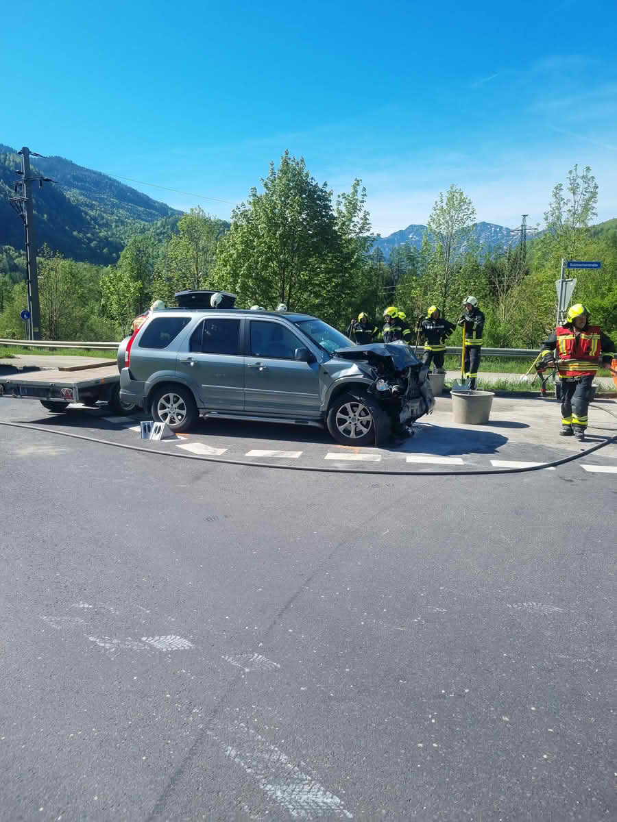 Die herbeigerufenen Kräfte der Feuerwache Sulzbach und der Hauptfeuerwache Bad Ischl, reinigten die verschmutzte Unfallstelle von herumliegenden Teilen und ausgeflossenen Betriebsmittel.