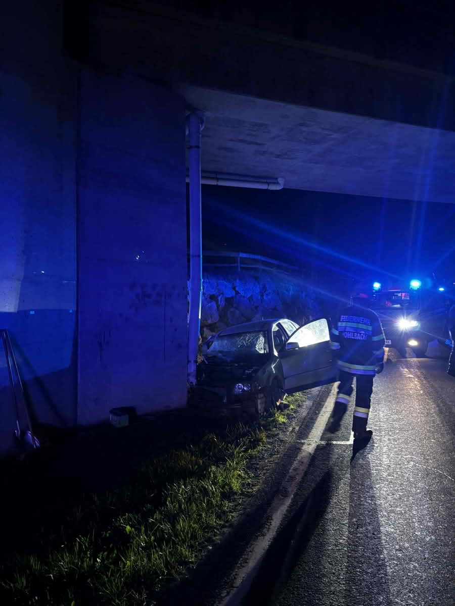 Die Feuerwehr Hohlbach-Riemerberg wurde am 14. April gegen 22:00 Uhr gemeinsam mit dem Roten Kreuz und der Polizei zu einem schweren Verkehrsunfall alarmiert. Ein Fahrer touchierte mit seinem Fahrzeug auf der B-74, der Sulmtal-Bundesstraße, aus ungeklärter Ursache zuerst eine Steinmauer, ehe er ca. 50 Meter weiter frontal gegen das Fundament der Bahnunterführung prallte.