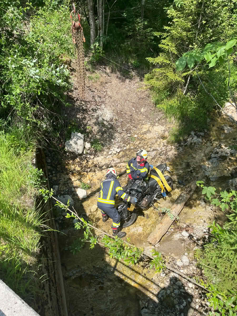 Ein Motorrad kam von der Fahrbahn ab und landete anschließend in einem Bachbett. Nachdem die Einsatzkräfte der Rettung den Verunfallten versorgt haben und dieser abtransportiert wurde, reinigten die Kameraden der FF Mitterweißenbach die Unfallstelle. Das defekte Motorrad wurden mittels Ladekran vom LAST Mitterweißenbach geborgen und von einem Abschleppunternehmen abtransportiert.