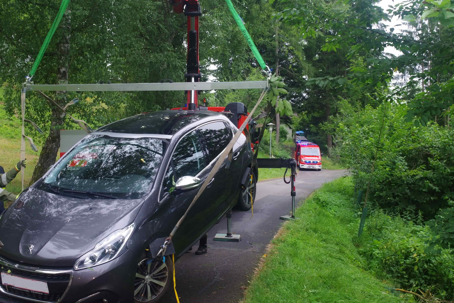 Die Feuerwehren von Sankt Martin an der Raab, Eisenberg an der Raab und Jennersdorf hoben den nur leicht beschädigten PKW mit einem LKW-Ladekran wieder zurück auf die Fahrbahn.