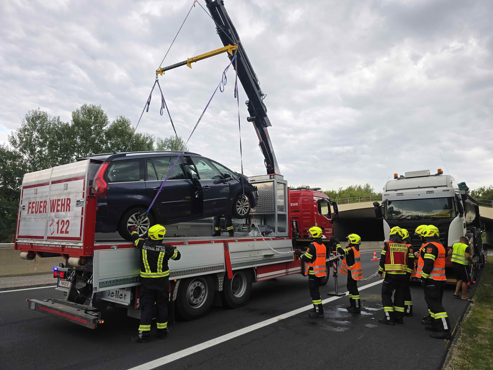 Die verkeilten Fahrzeuge konnten nach Anheben der Sattelzughinterachse getrennt werden. Im Anschluss wurde der PKW mittels Kran des Wechselladerfahrzeuges verladen und gesichert abgestellt. Der Sattelzug konnte seine Fahrt selbständig fortsetzen.