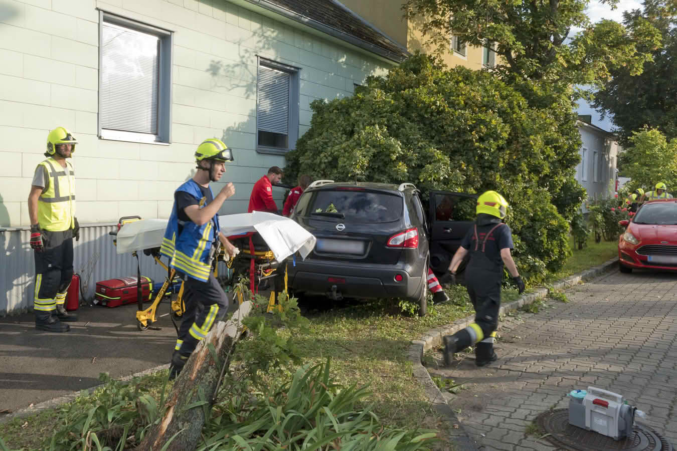 Bei solch einer Meldung macht man sich natürlich schon bei der Anfahrt Gedanken, was einem vor Ort erwarten könnte. An der Einsatzstelle angekommen bot sich dann den Einsatzkräften folgende Lage: Die Lenkerin eines Pkw fuhr auf der Badener Straße im Ortsgebiet von Pfaffstätten in Richtung Baden, als sie plötzlich, aus bislang unbekannter Ursache, nach links von der Fahrbahn abkam und frontal gegen einen am Straßenrand stehenden Baum prallte. Der Anprall war dabei so heftig, dass der Baum knickte und mitgerissen wurde, ehe der Unfallwagen am Gehsteig und Grünfläche zum Stillstand kam.