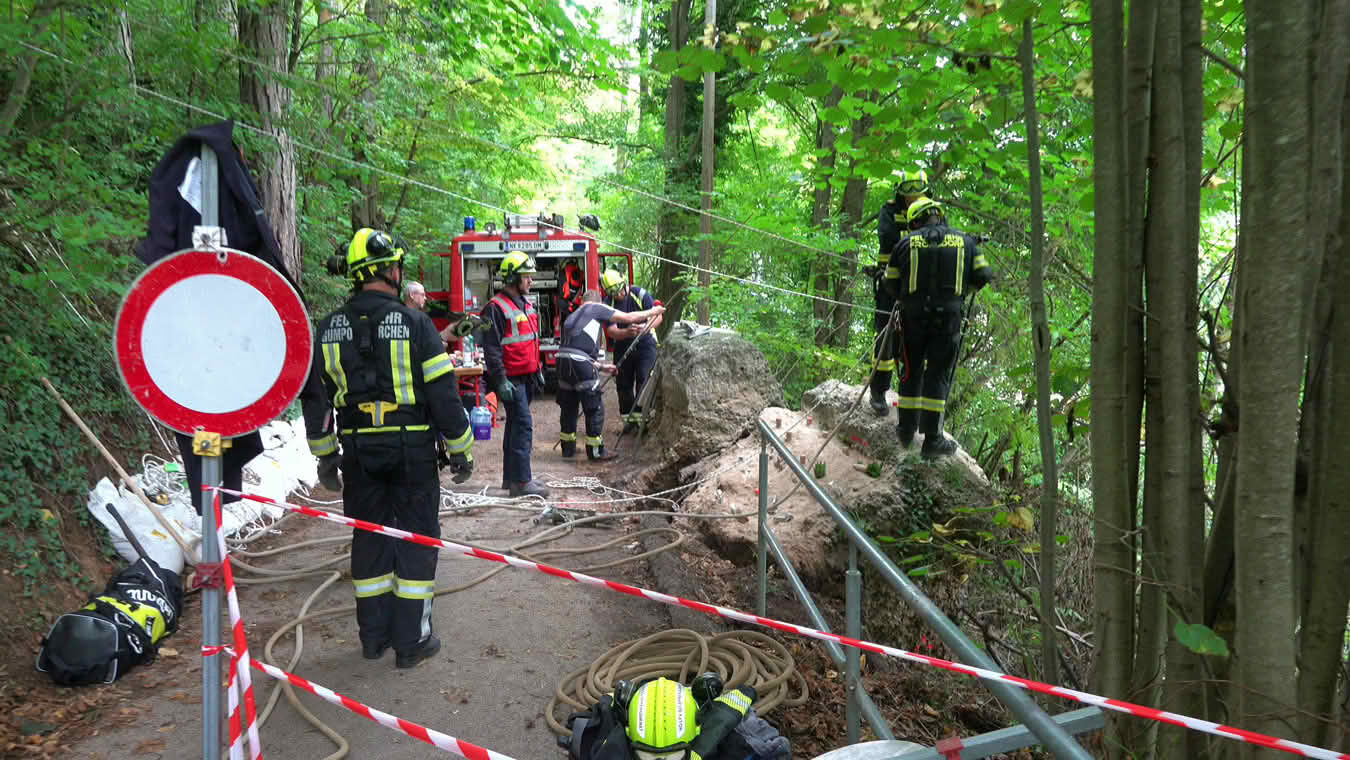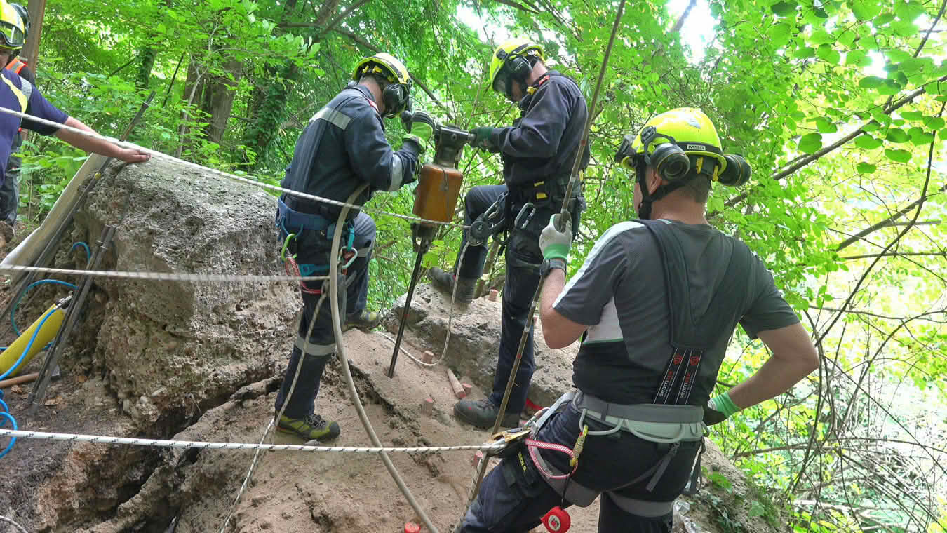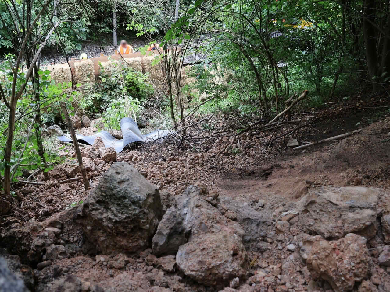 Die geologische Lagebeurteilung ergab, dass sich der Boden des steilen Abhangs – vermutlich infolge der starken Regenfälle der vergangenen Tage – aufgeweicht und abgesenkt hatte. Dadurch drohten ein massiver Felsbrocken sowie Teile des Hangs abzurutschen. Als einzig mögliche Maßnahme wurde eine kontrollierte Sprengung des gefährdeten Gesteins veranlasst.