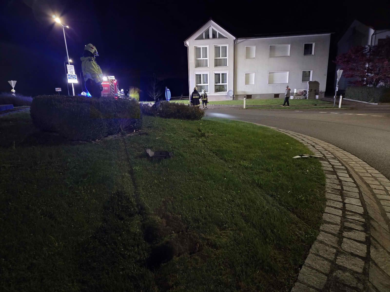 Die Florianis leuchteten die Unfallstelle aus und reinigten die Fahrbahn. Zum Glück überfuhr der Lenker lediglich die Büsche und Verkehrsschilder und nicht die in der Mitte befindliche Steinskulptur.
