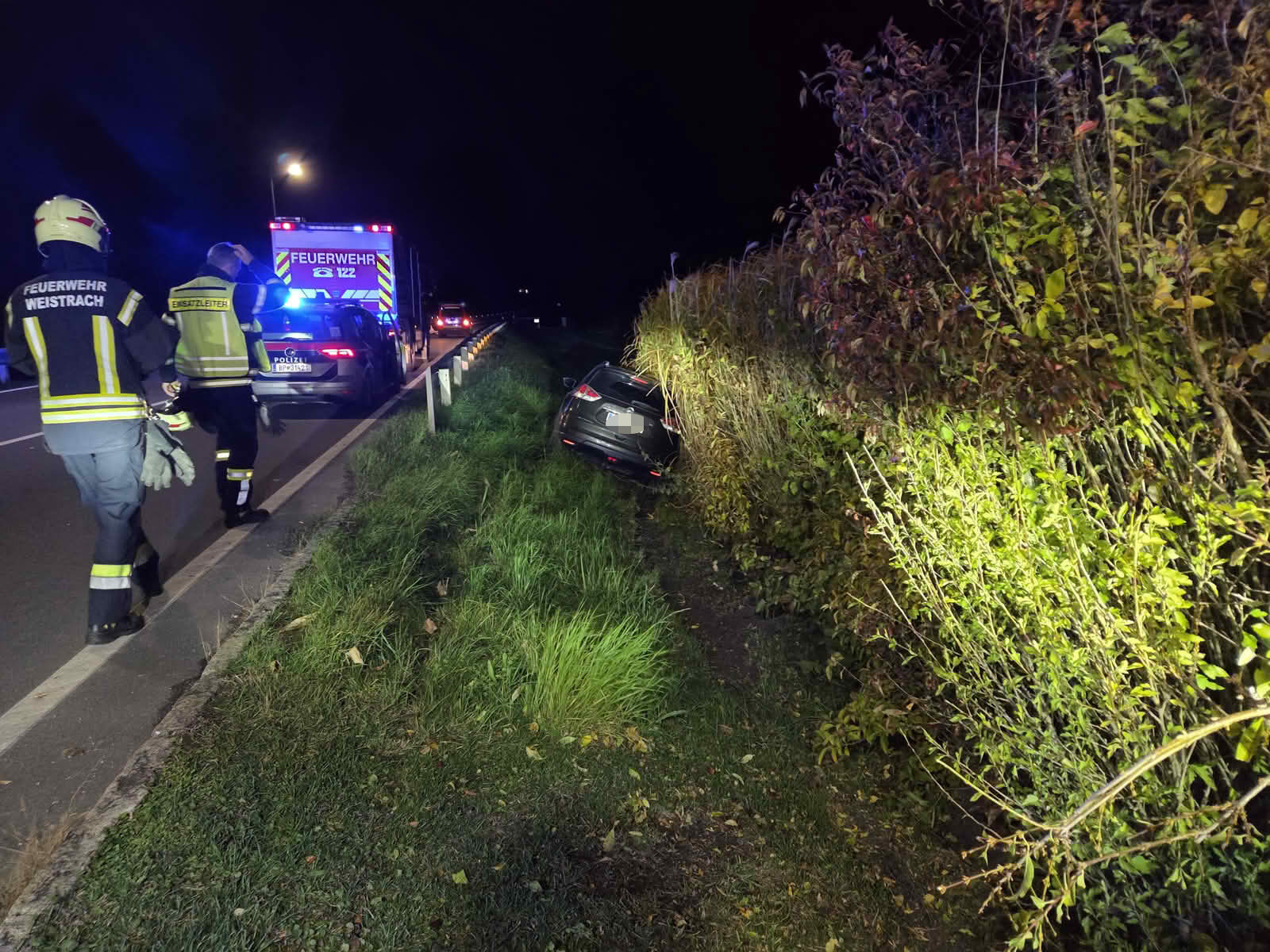 Am Abend des 26.10.2025 wurde die FF Weistrach zu einem PKW im Graben auf die LH 85 alarmiert. Bei der Lageerkundung stellte sich heraus, dass ein Lenker geradeaus über den Weistracher Kreisverkehr fuhr und rechts der Leitschiene zum Stillstand kam.