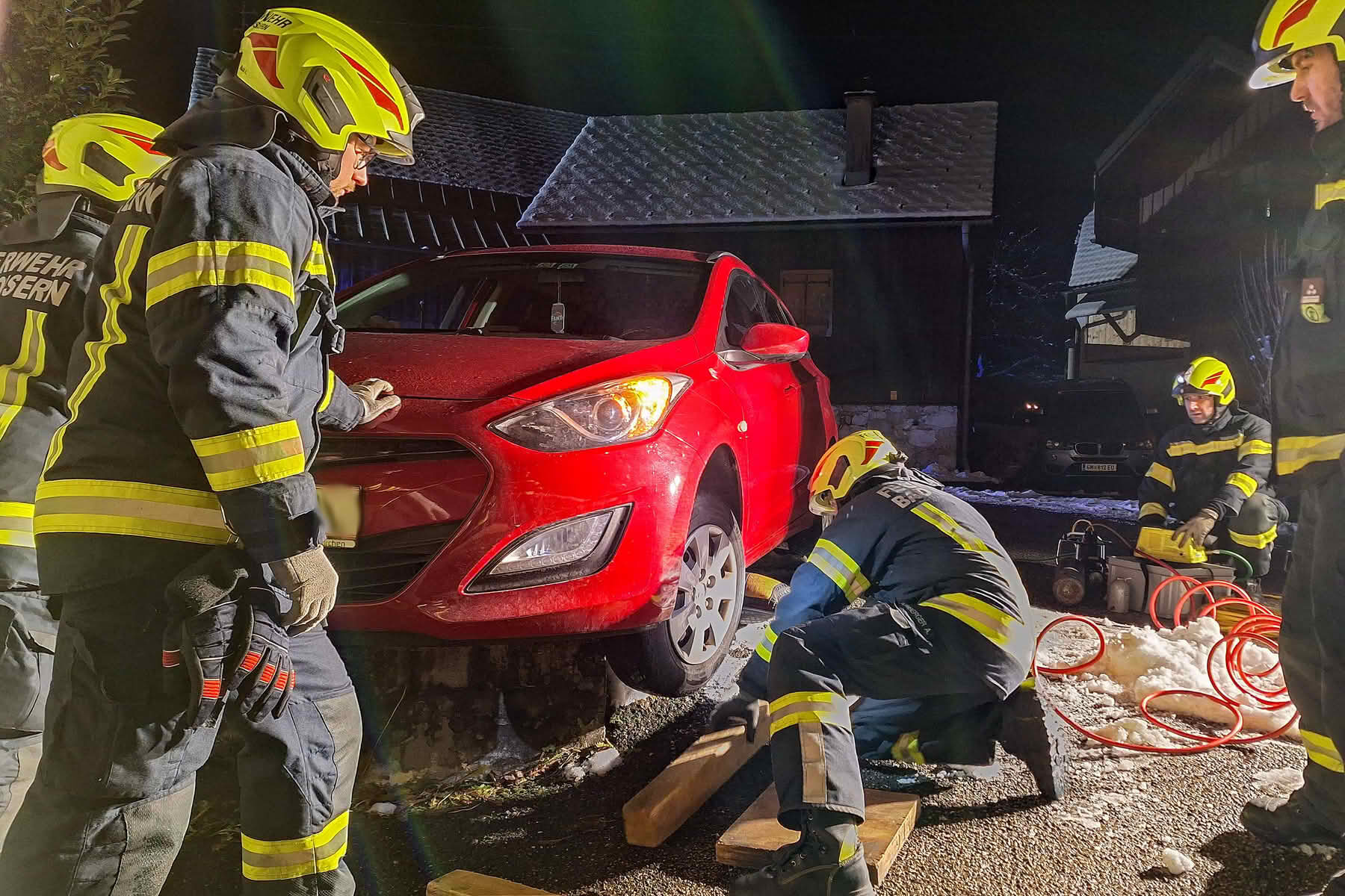 Rasche Hilfe kam dann von den herbeigerufenen KrÀften der FF Bad Goisern: Nach dem Absichern und Ausleuchten der Einsatzstelle wurden Hebekissen zum Einsatz gebracht, mit dem der PKW dann schonend angehoben und aus der misslichen Lage befreit werden konnte.