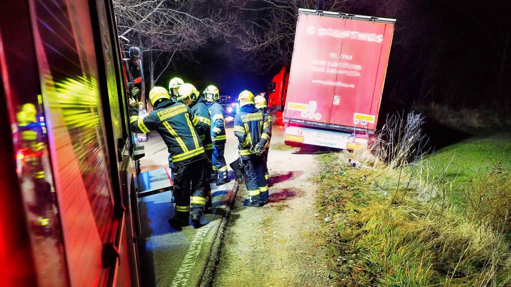 Durch ein missglücktes Fahrmanöver in den Abendstunden des 16.12.2025 geriet ein LKW Lenker mit seinem Sattelzug in aufgeweichtes Erdreich und in Schieflage.