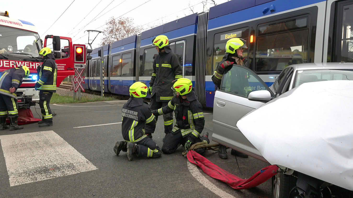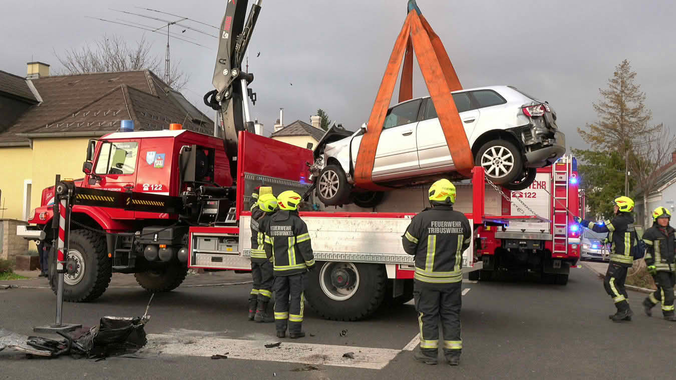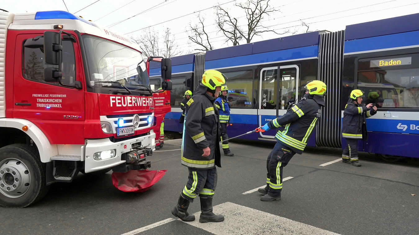 Passanten wählten daraufhin den Notruf 122 und meldeten diesen Unfall bei der Feuerwehr. Da jedoch nicht bekannt gegeben werden konnte, ob die Insassen im Unfallwagen eingeklemmt oder ob auch andere Personen verletzt sind, wurde die örtliche Freiwillige Feuerwehr Tribuswinkel, sowie laut Alarmstufe T2 auch die FF Pfaffstätten mit dem Lagebild „Verkehrsunfall Unklare Lage“ mit Zusatz Pkw gegen Badner Bahn alarmiert.