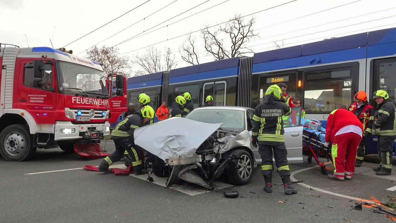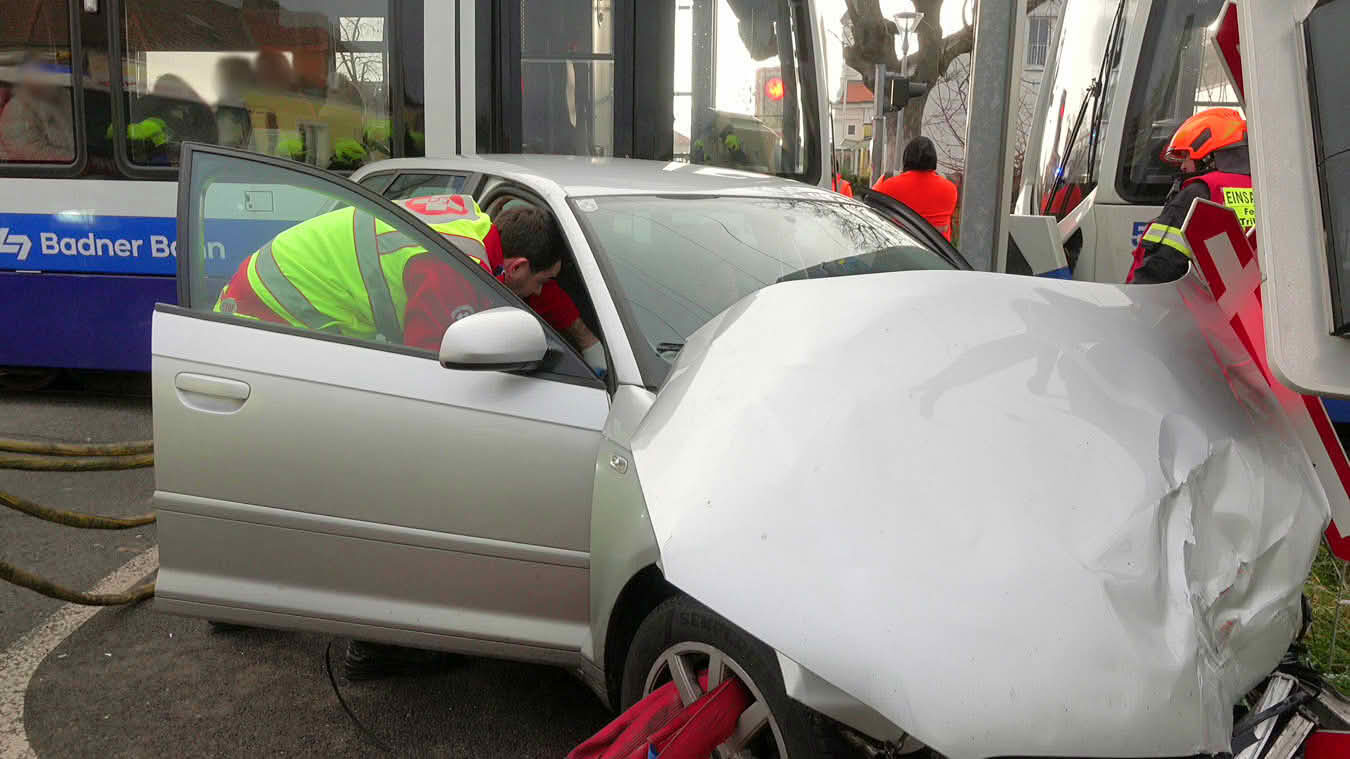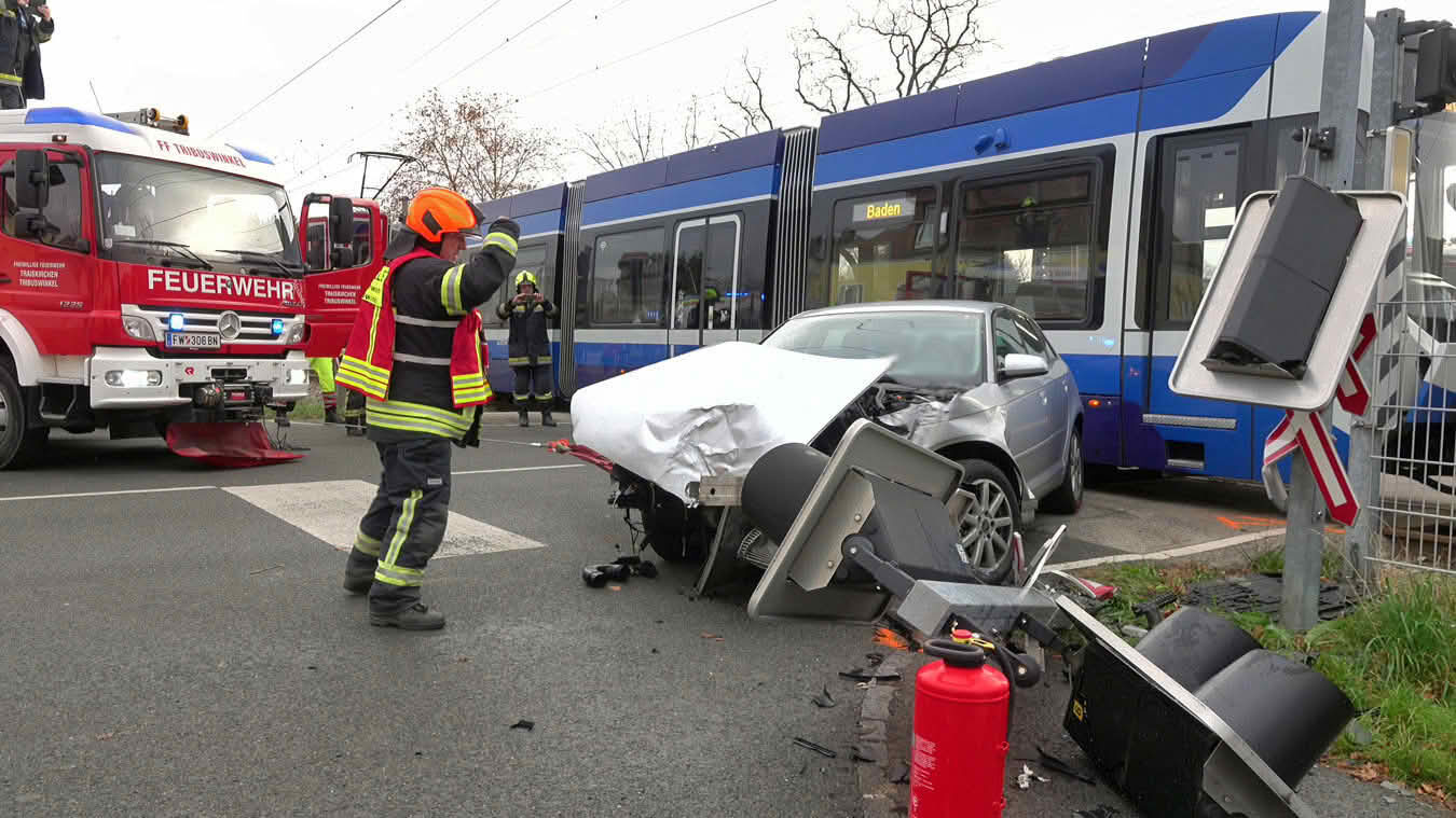 Ein Pkw mit zwei Insassen prallte gegen eine in Richtung Baden fahrende Garnitur der Badner Bahn. Dabei wurde das Fahrzeug vorne voll erfasst und gegen eine Lichtsignal-Anlage geschleudert.