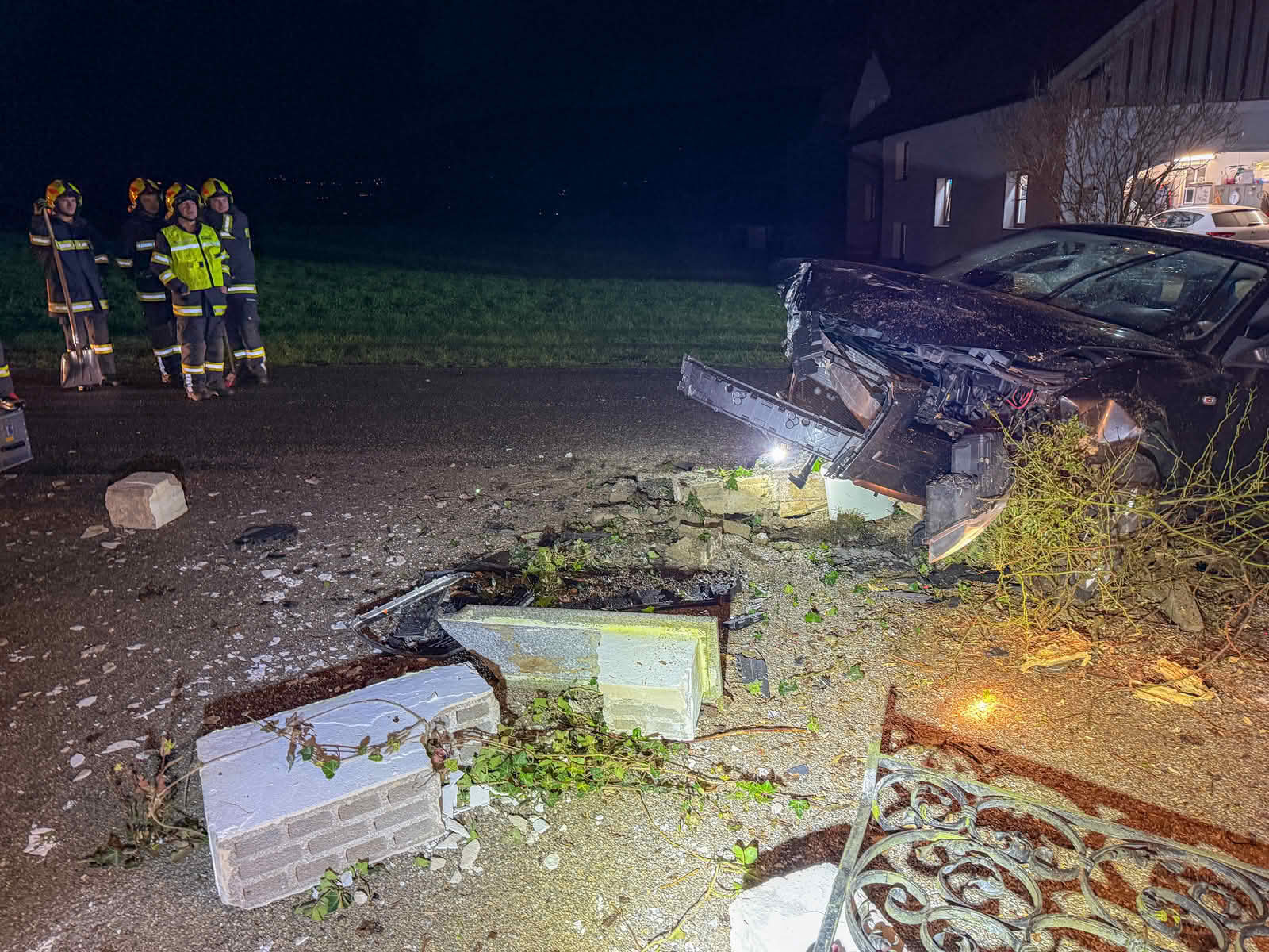 Beim Aufprall auf die Gesteinsmauer wurde die rechte Felge völlig von der Vorderachse abgerissen und in ein angrenzendes Bachbett geschleudert. Nach dem Aufprall auf die Gartenmauer stürzte diese um und der PKW kam darauf zum Stehen.