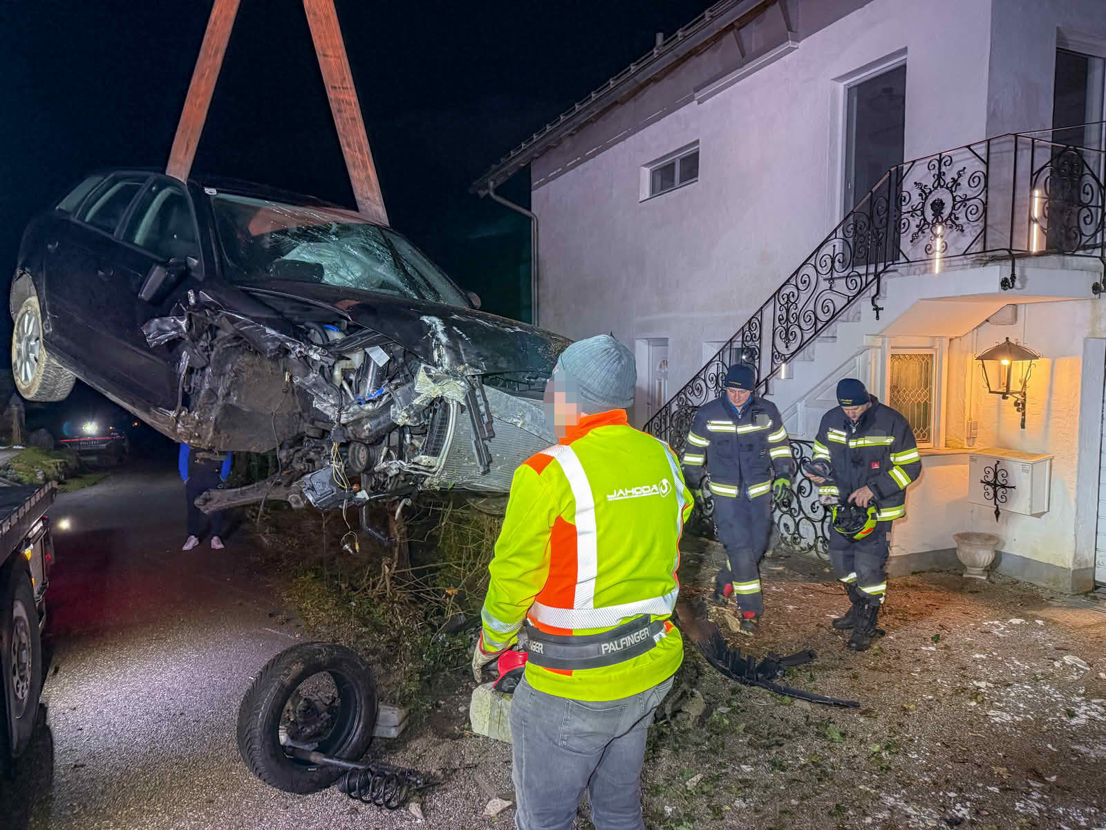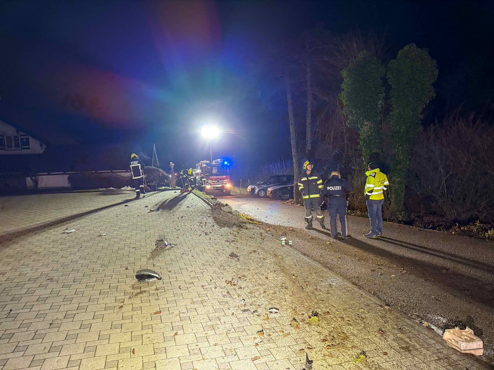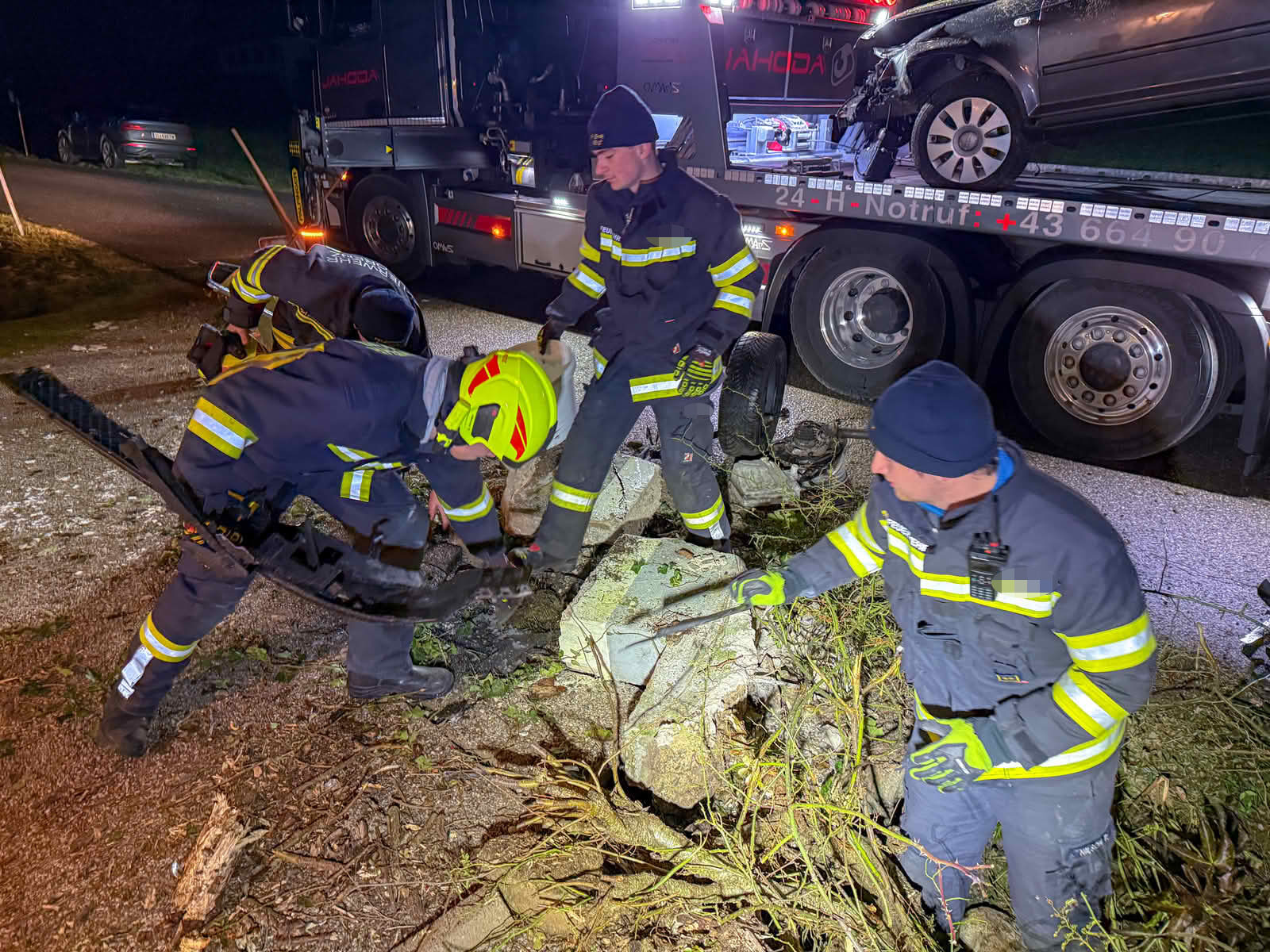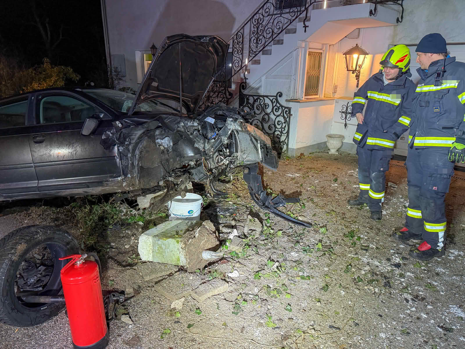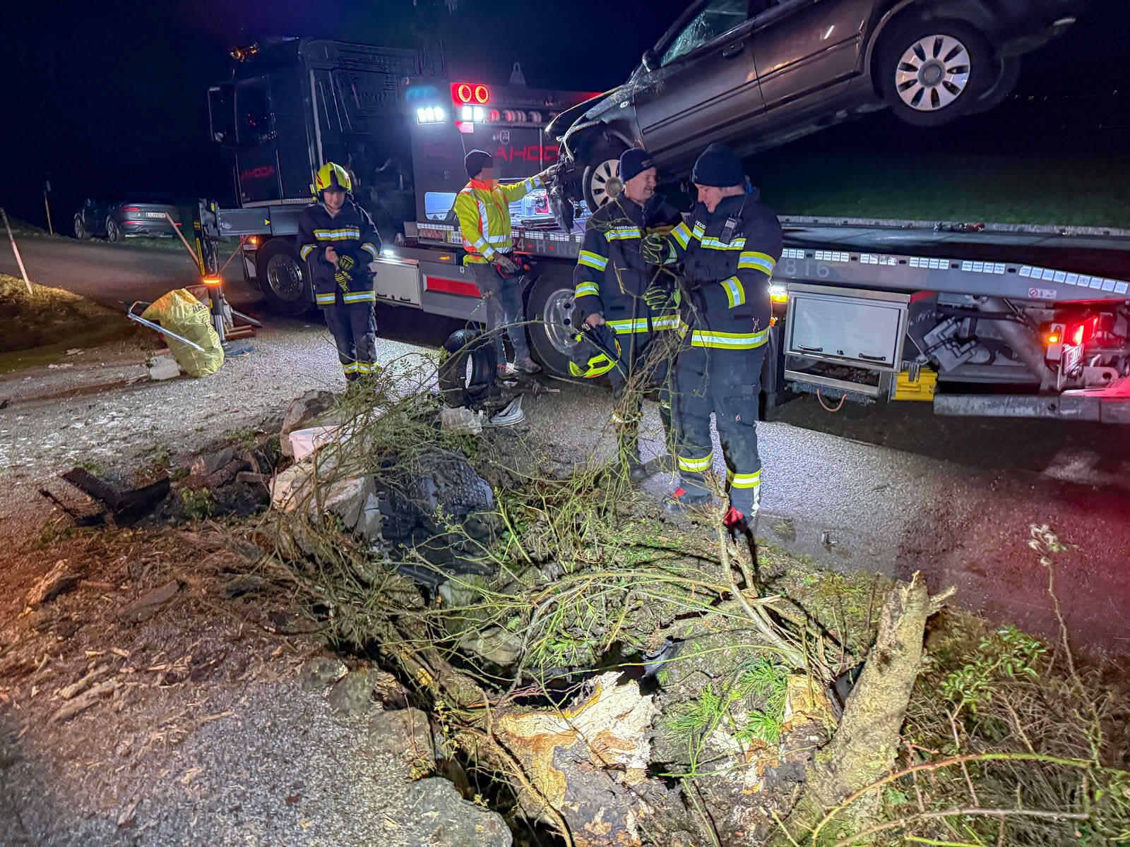 Einsatzleiter Wolfgang Schachl berichtet von der Lage beim Eintreffen: „Ein mit fünf Jugendlichen besetzter PKW war am rechten Fahrbahnrand in eine Gesteinsmauer gekracht, hob ab und flog auf die andere Straßenseite, dort wurde eine Gartenmauer und ein Baum umgerissen. Alles fünf Insassen konnten sich selbst befreien.“