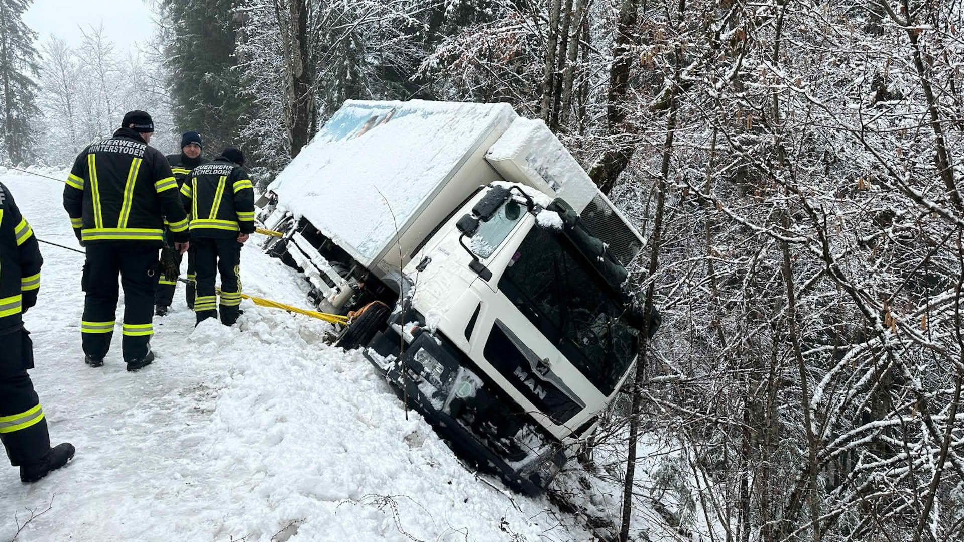 Da der LKW in einer schwierigen Lage gesichert und geborgen werden musste, war schnell klar, dass wir hier Unterstützung mit Spezialgerät benötigen. Während wir die Unfallstelle absicherten und die ersten Vorbereitungen trafen, wurde der technische Zug der FF Micheldorf angefordert.